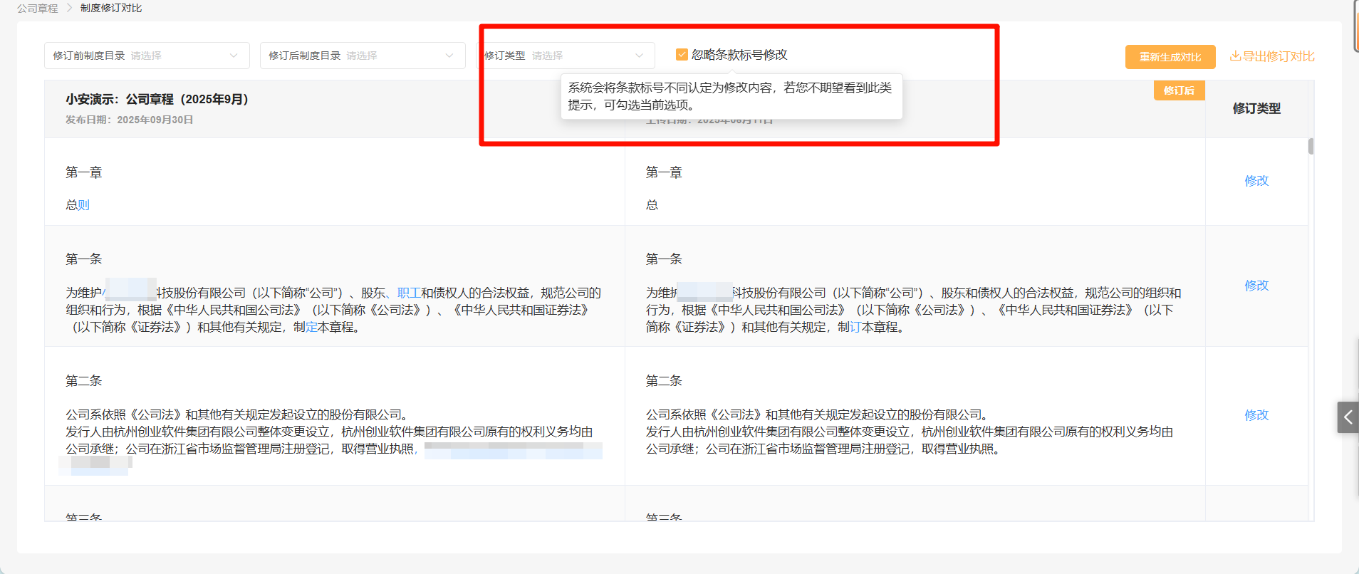 公司规章制度中新旧制度修订对比支持忽略标号差异。