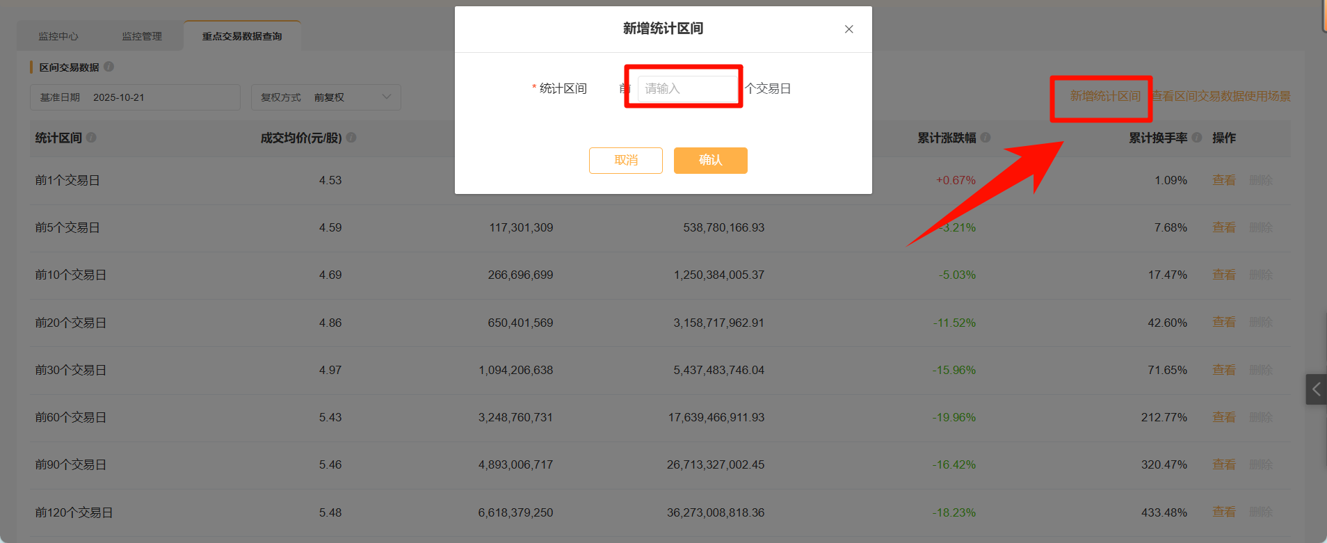 监控提醒助手-重点交易数据查询功能支持用户自定义设置前x个交易日区间。