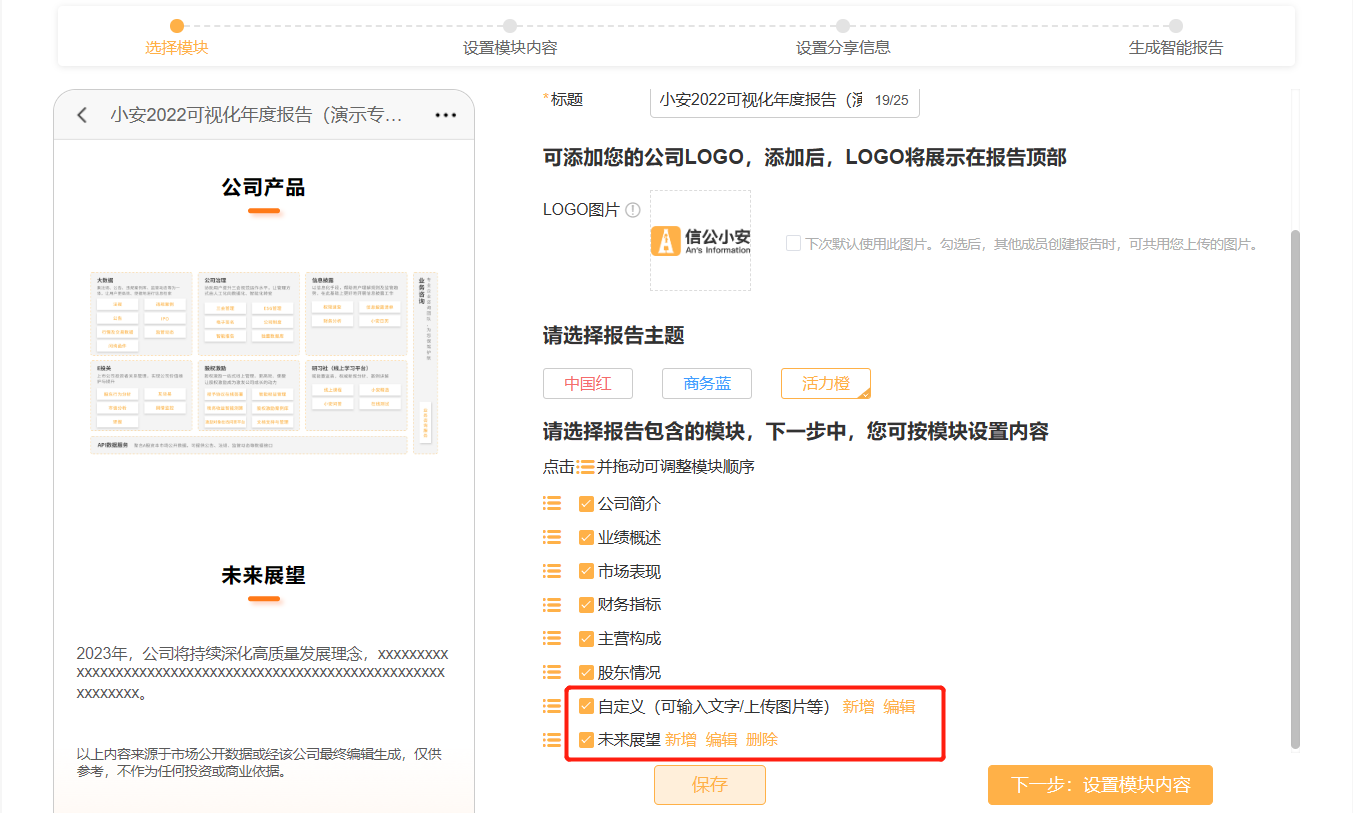 支持添加多个自定义模块,通过图文形式展示董事长寄语、公司产品、未来展望等多项内容。