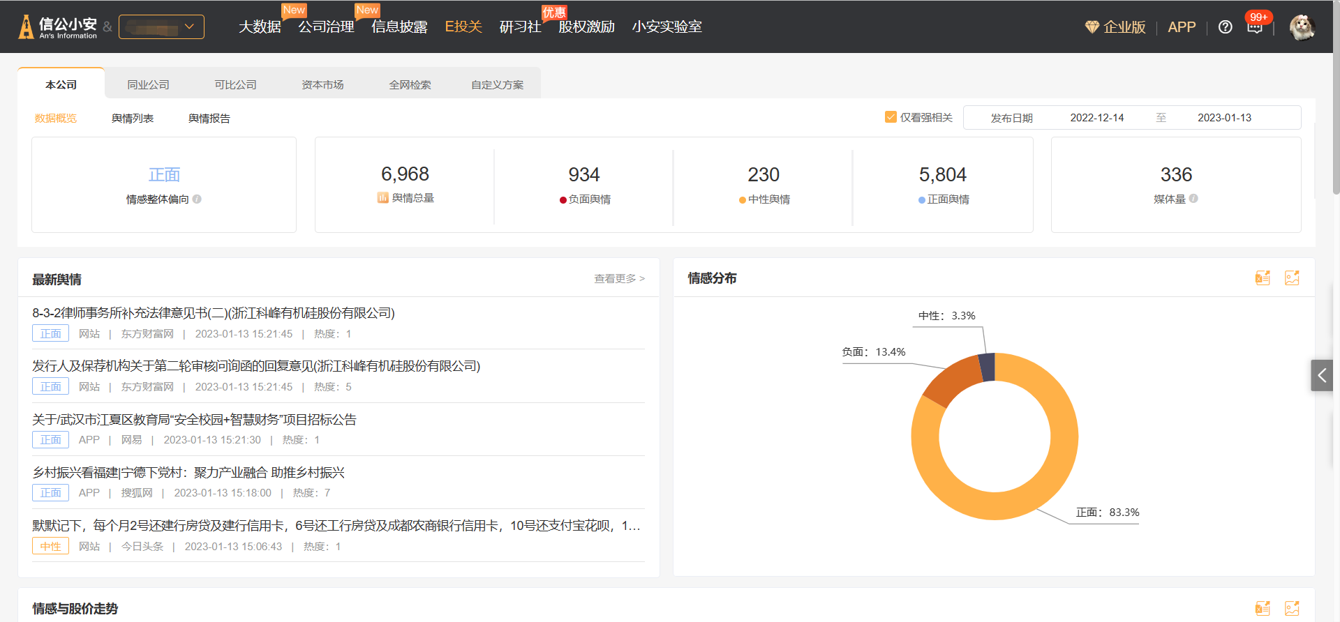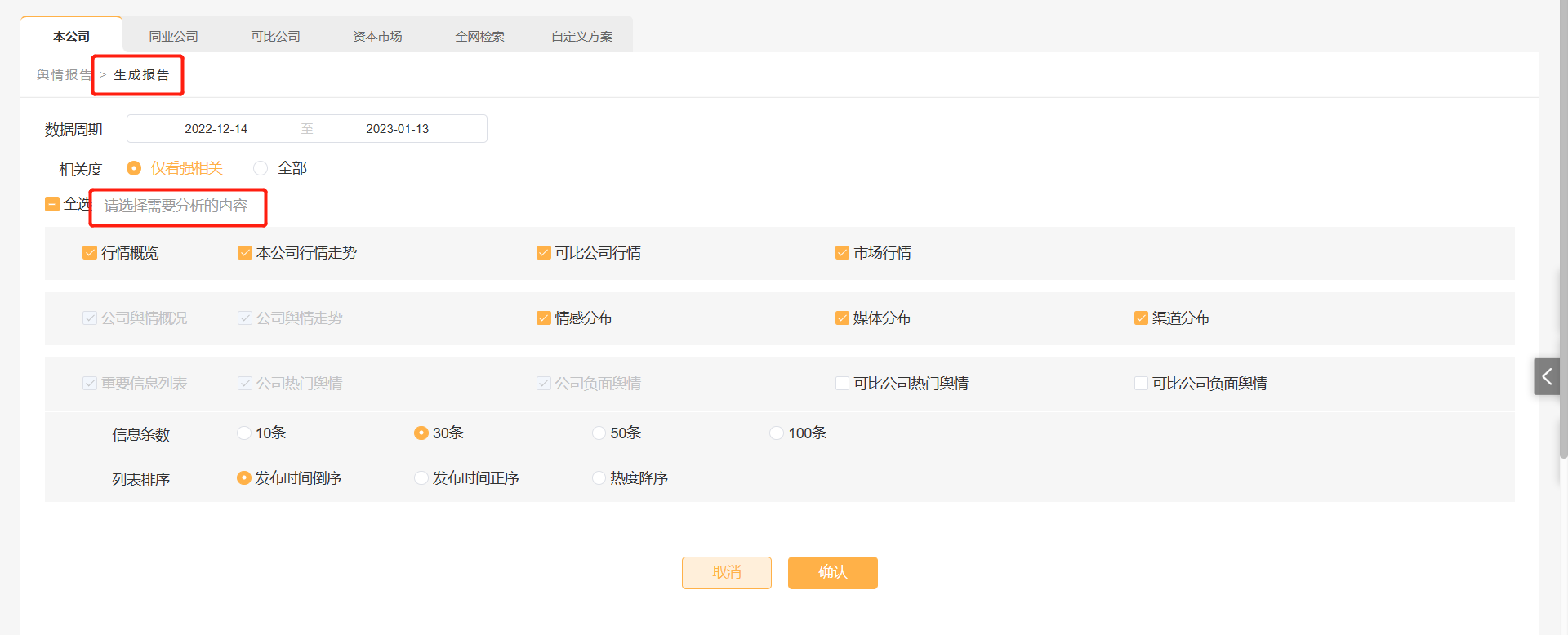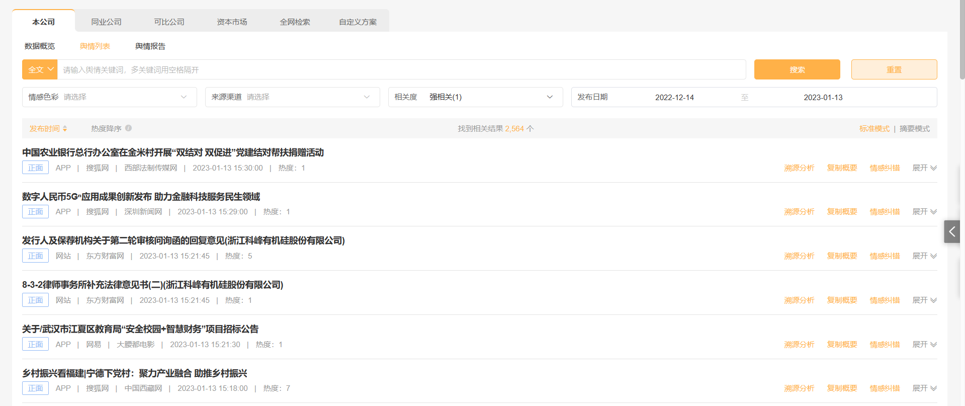 除本公司、同业公司、可比公司、资本市场公司舆情外,还支持全网舆情检索;