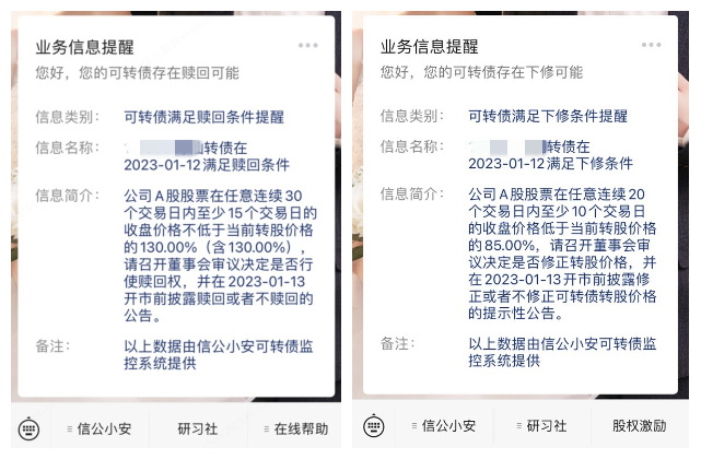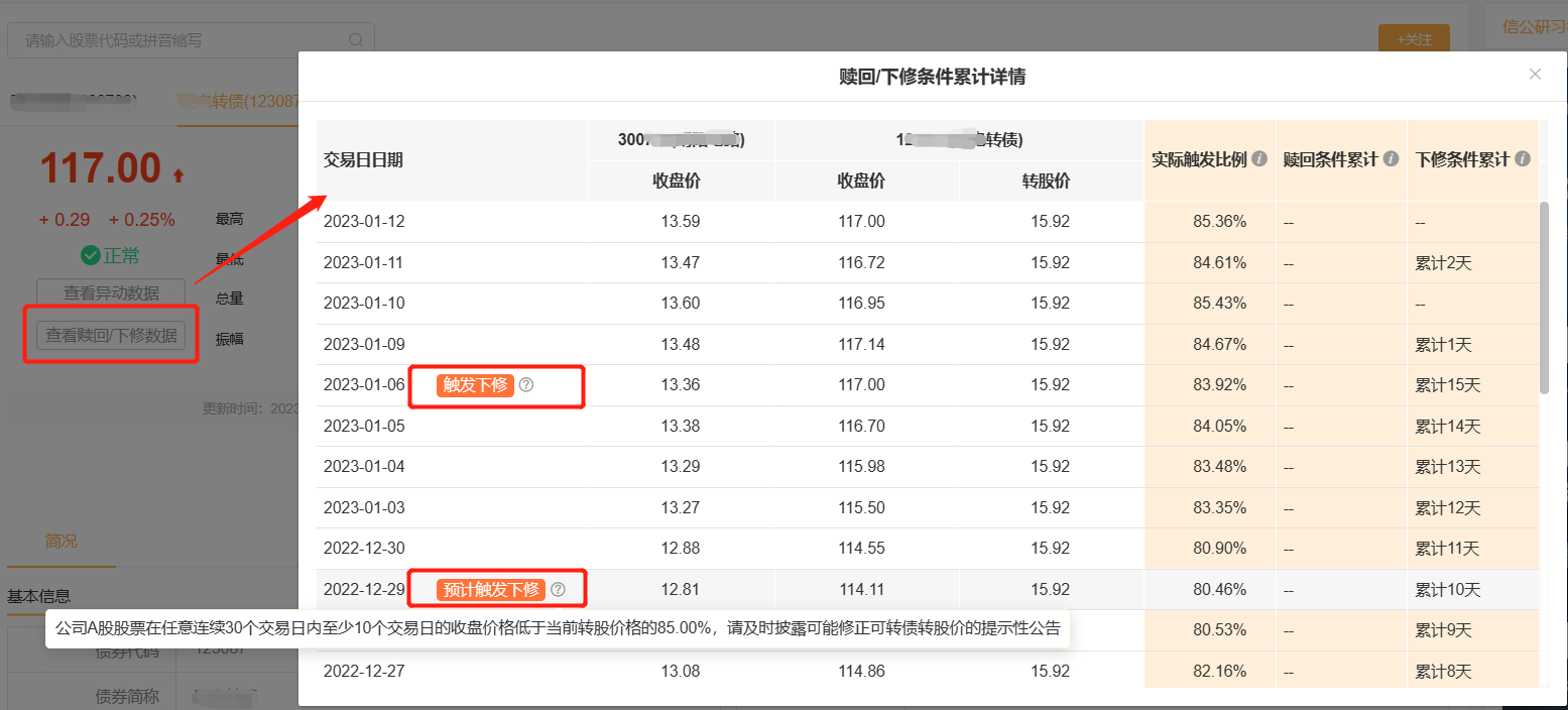 根据公司可转债的下修/赎回条款,结合规则上的披露要求,在行情页面可以实时关注可转债是否触发下修/赎回条件,除页面提示外,还将通过微信端提醒董办人员及时披露相关公告。