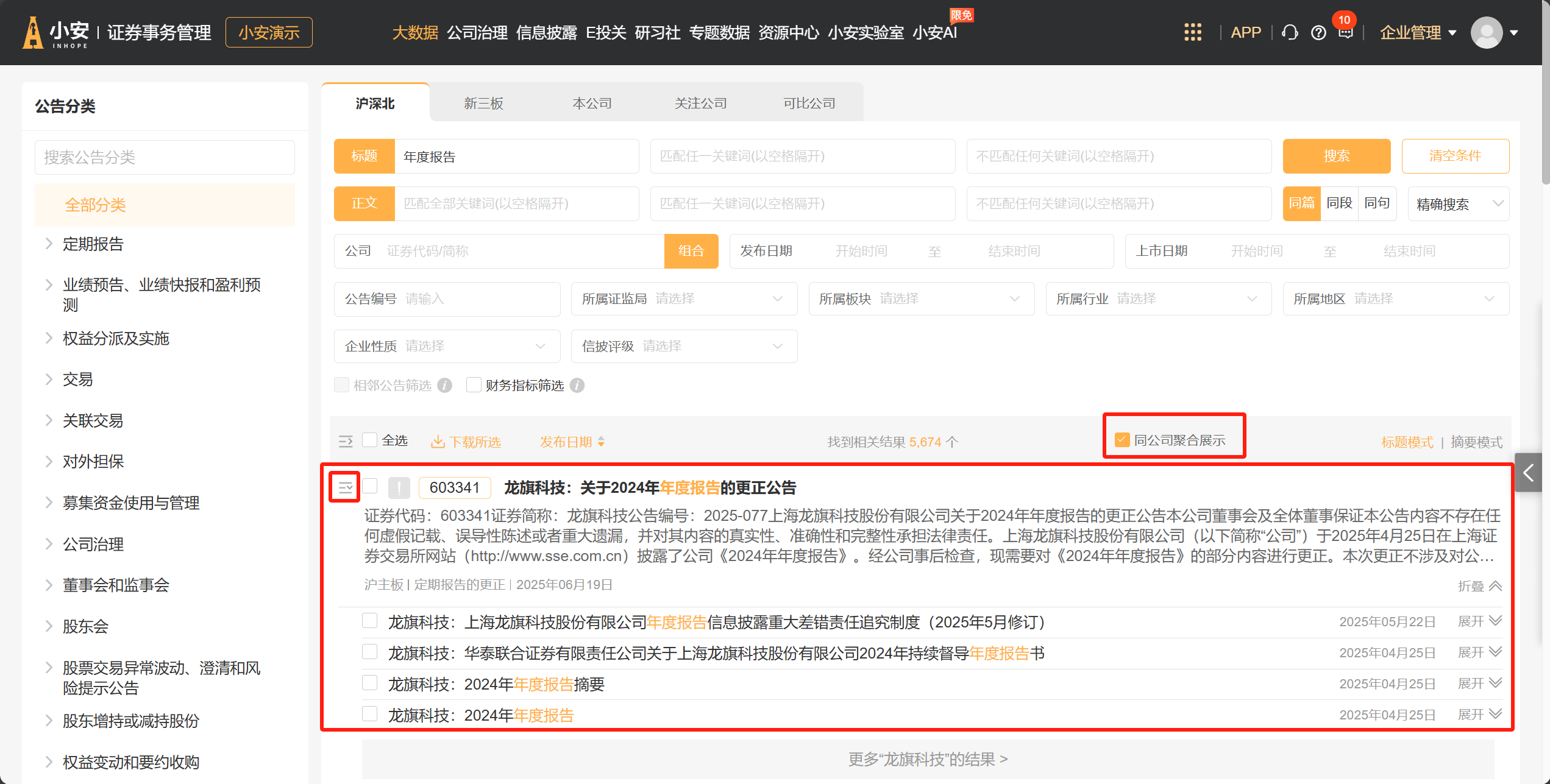 1、【公告】新增同公司公告聚合显示功能,使用场景:我们按发布时间搜索公告后,勾选“同公司聚合展示”,当前搜索条件下同一家公司的公告将集中展示,方便您快速查看公告。