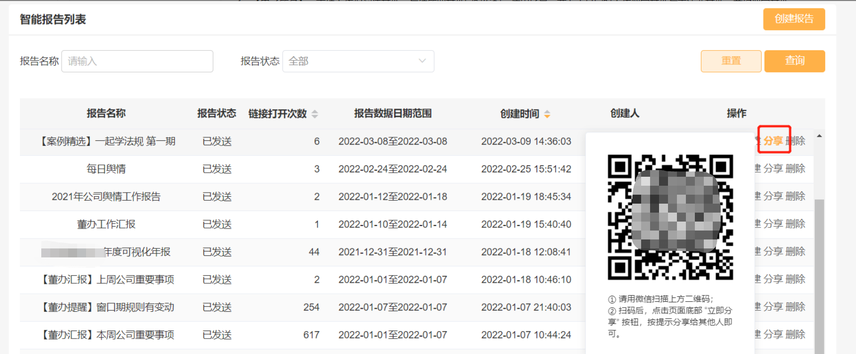 3、【智能报告】:优化智能报告分享功能,在列表页点击分享,即可扫码分享报告。