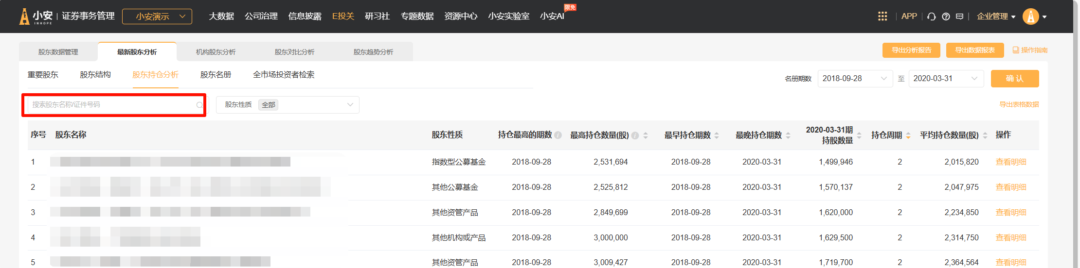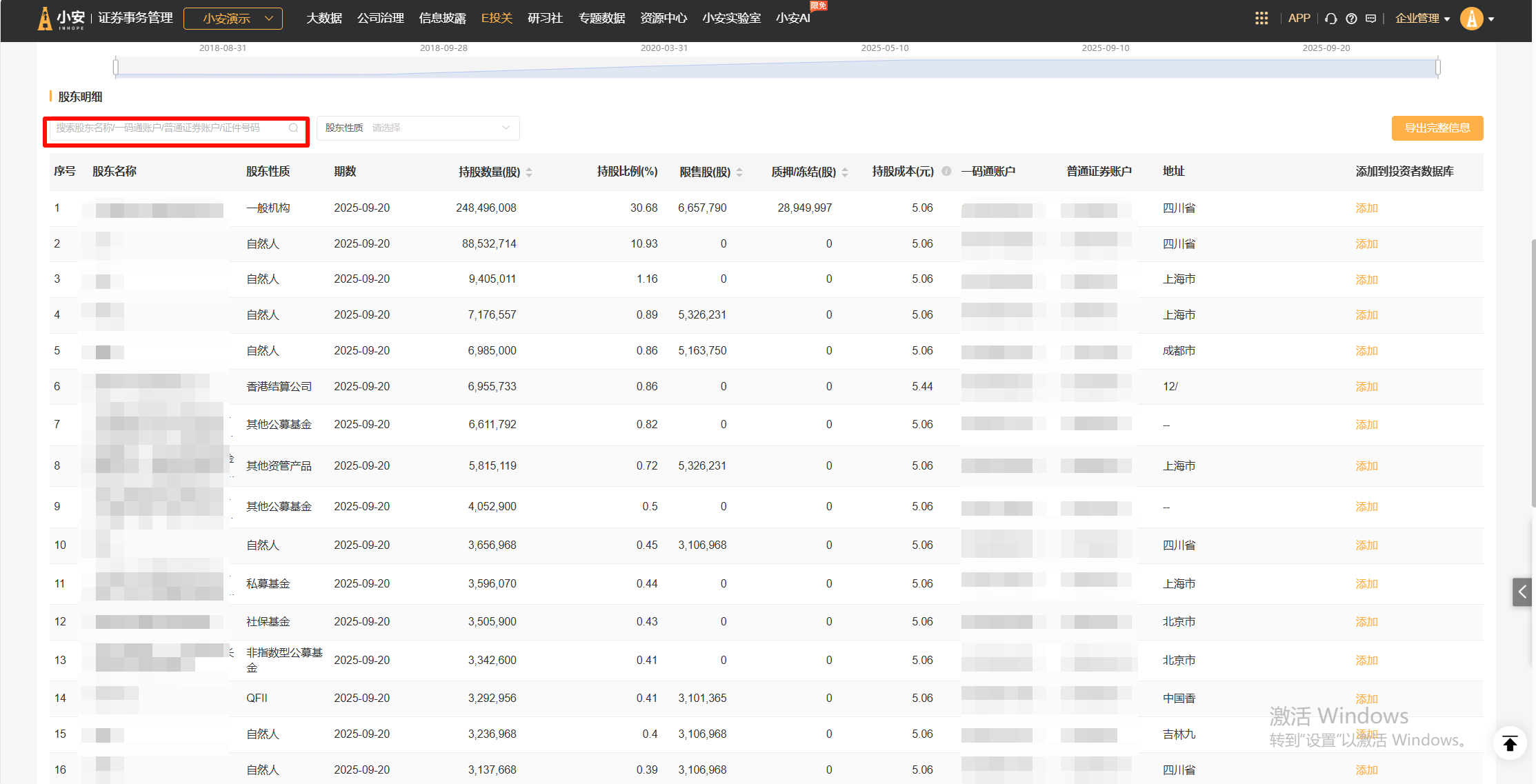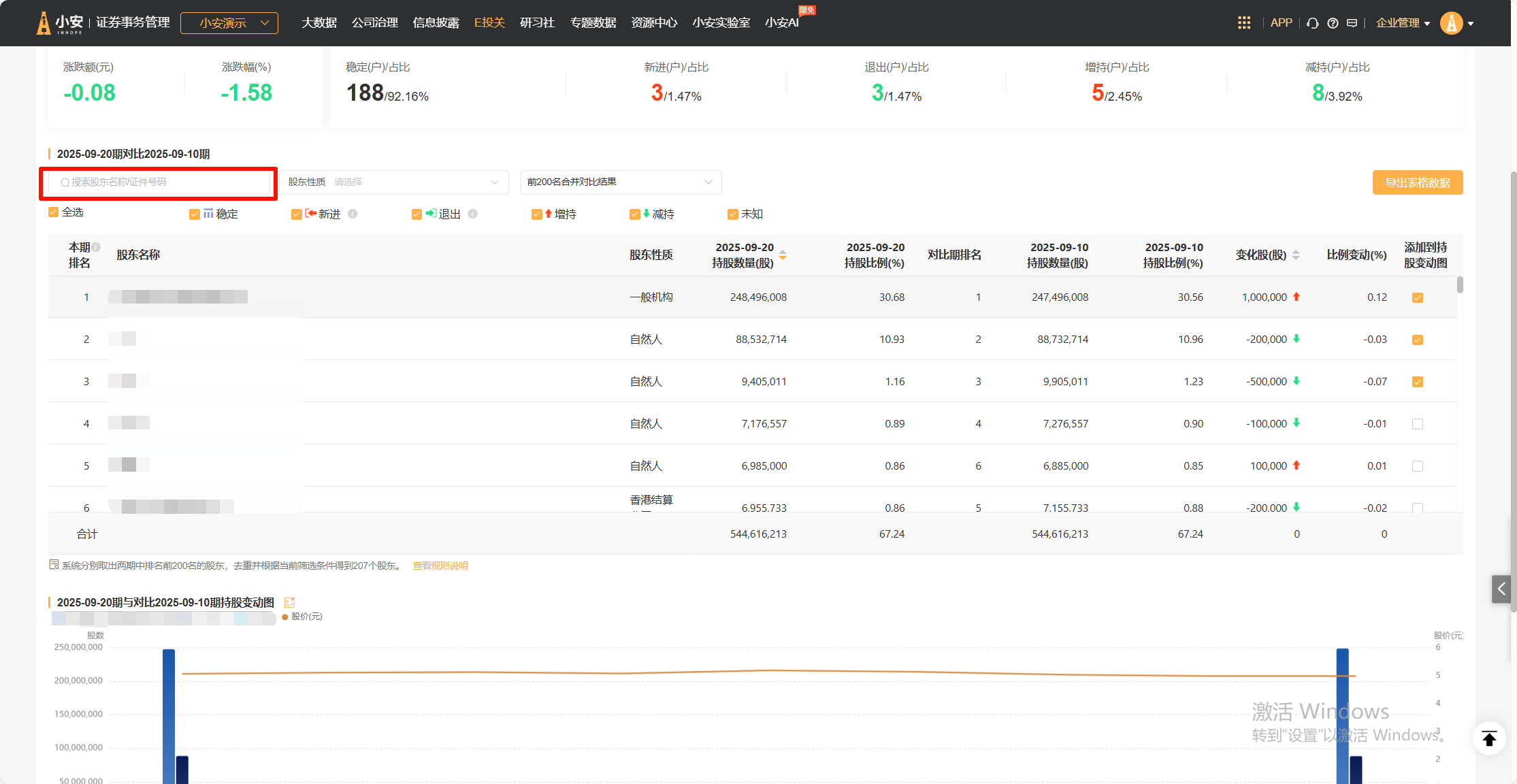 自然人股东名称搜索区域,支持通过证件号码搜索(影响区域:股东对比分析-股东名册分析总览、最新股东分析 - 股东持仓分析、最新股东分析 - 股东名册 - 股东明细)