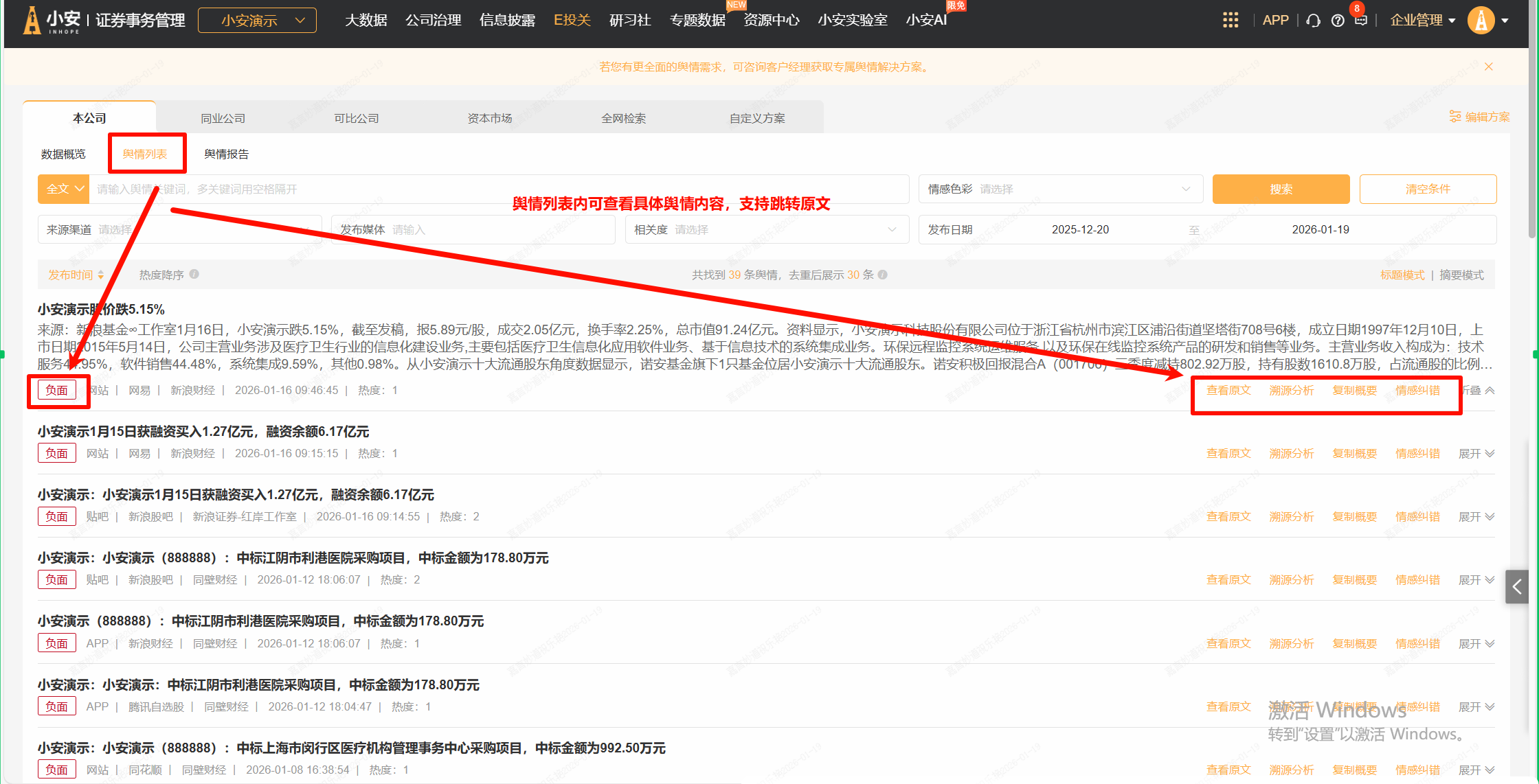小安的【舆情监控】栏目,为上市公司提供了专业的舆情数据监测、数据分析及在线生成报告等服务,协助公司准确掌握市场舆情及行业动态,即时把控舆情走势。