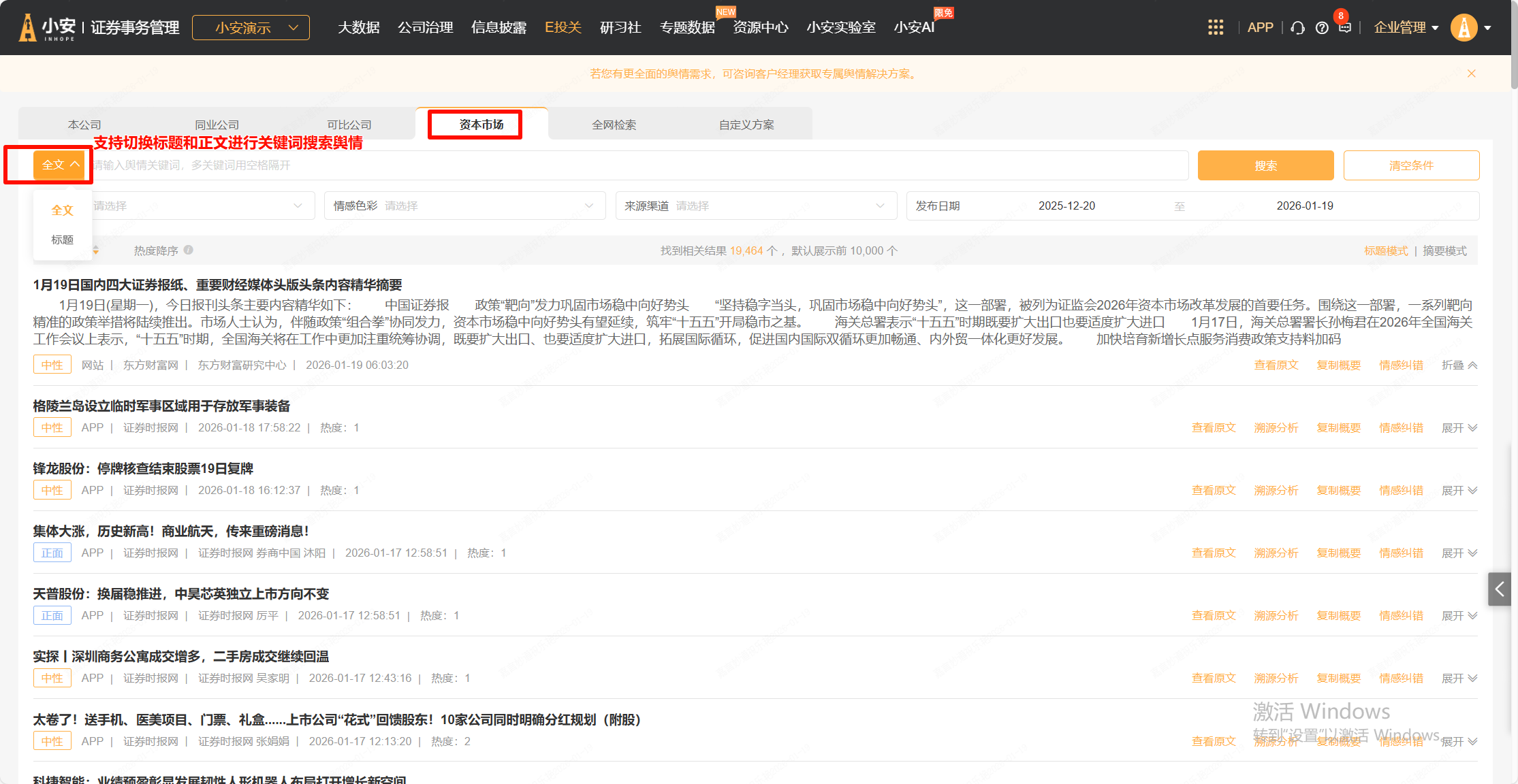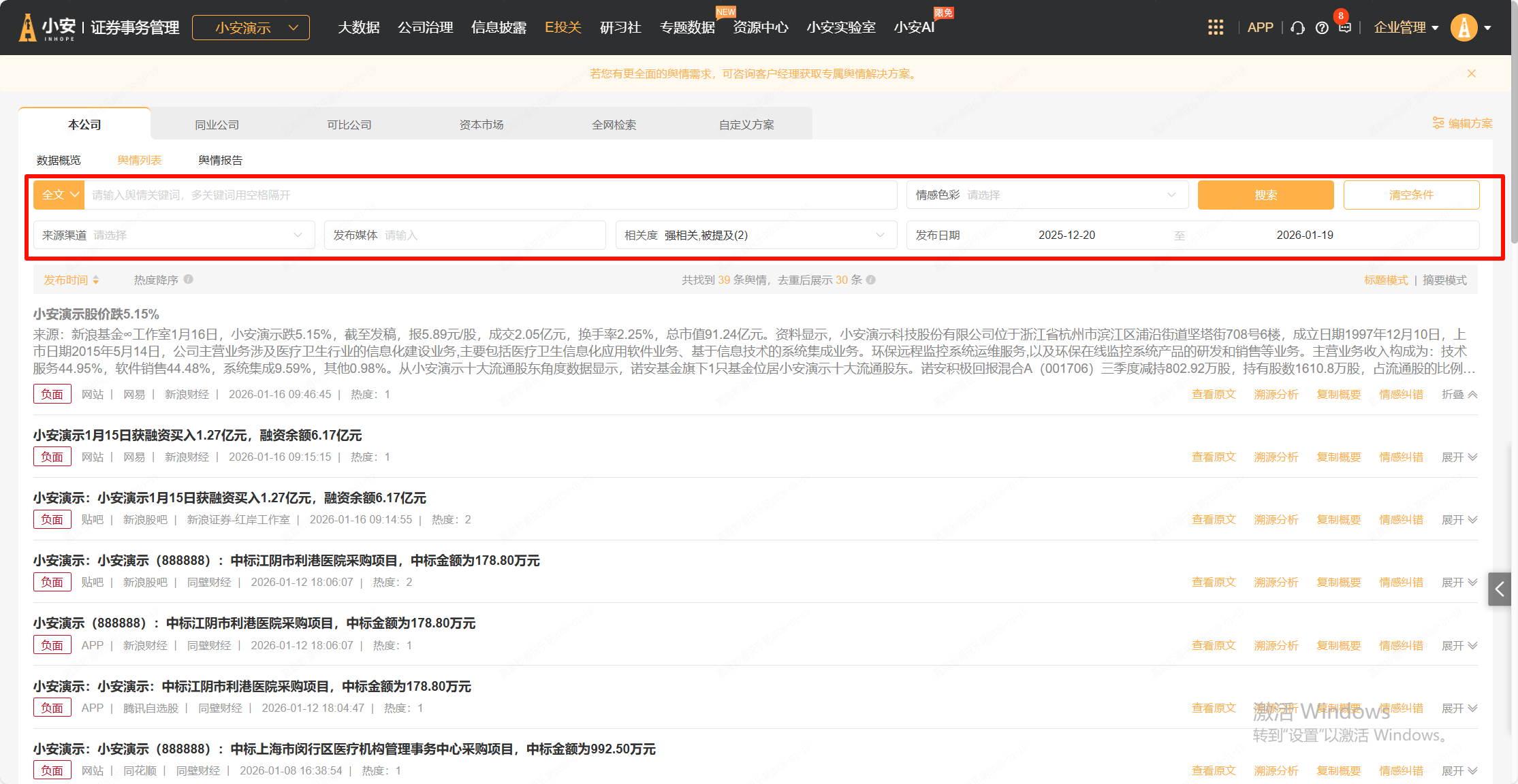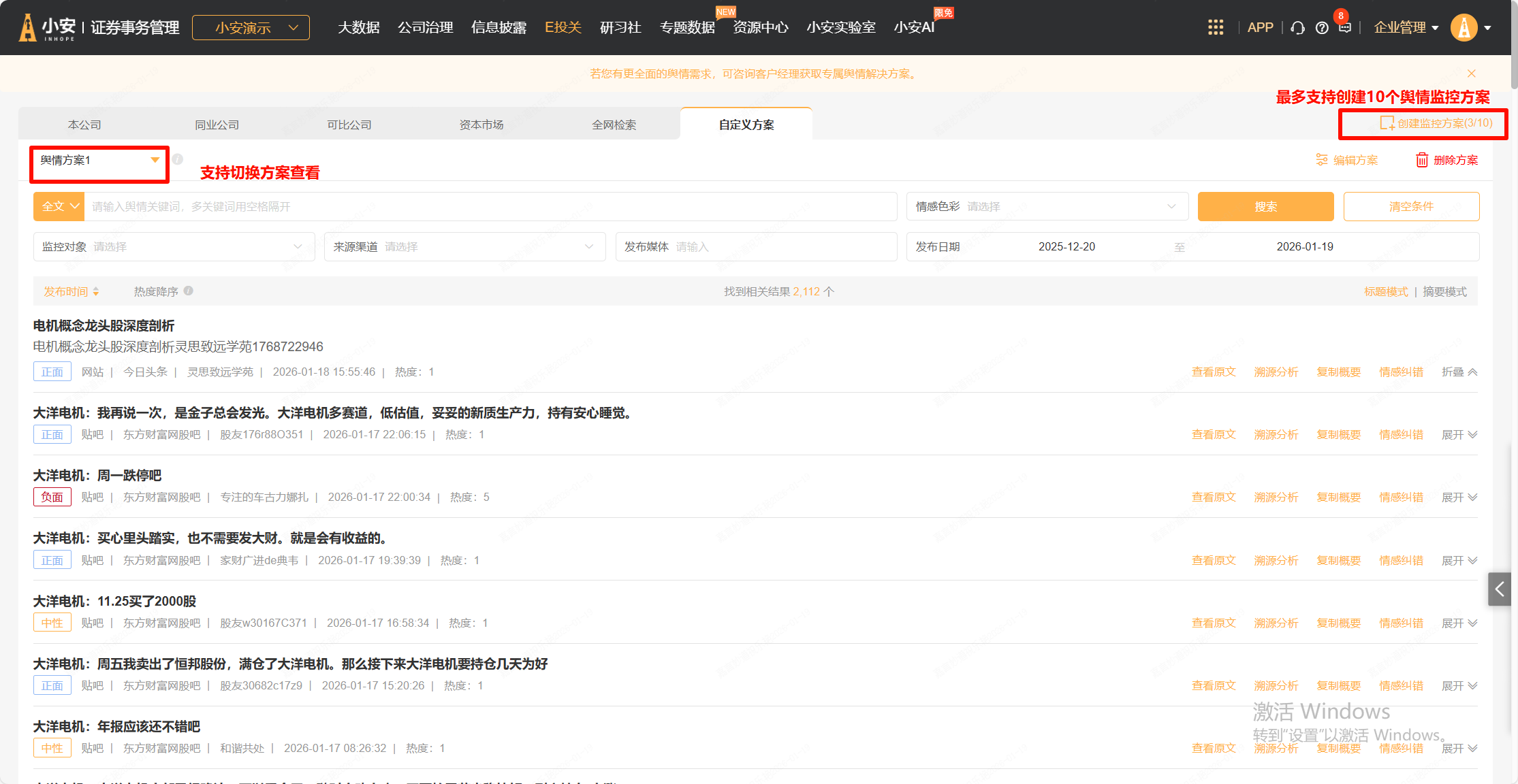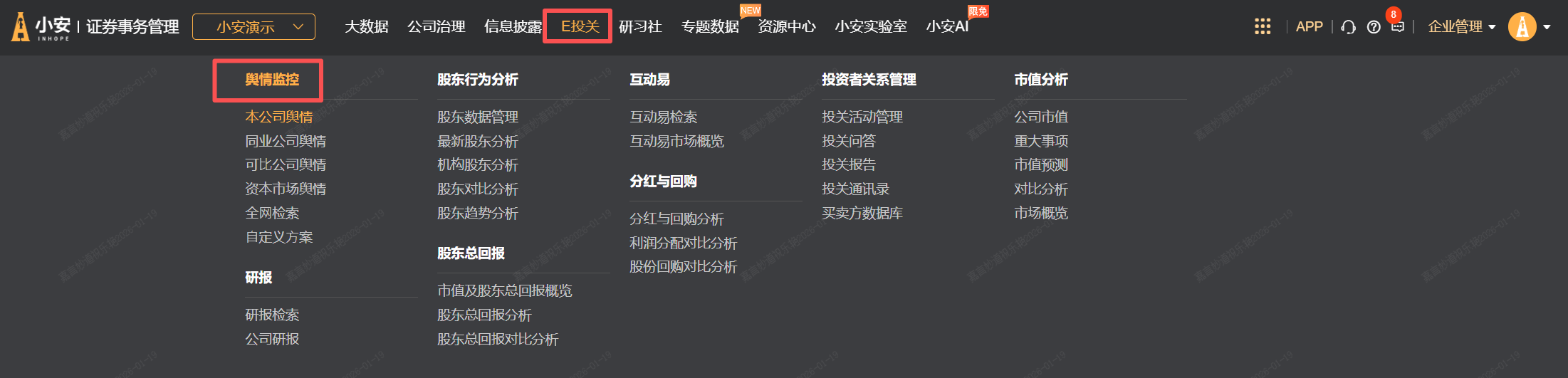 在【E投关】菜单下,点击【舆情监控】菜单,进入舆情监控页面。小安平台的舆情监控系统,覆盖了两微一端,可以对公司的舆情信息进行实时监控。