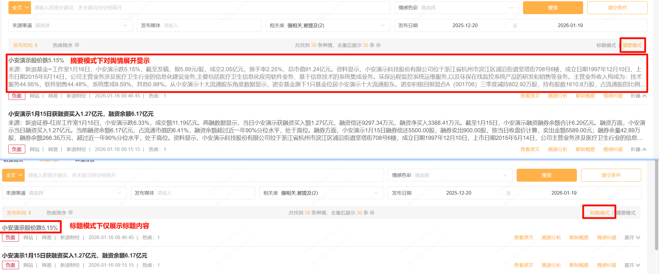 对于舆情列表的展现模块,可以通过右侧按钮将列表切换为“标题模式”或“摘要模式”。