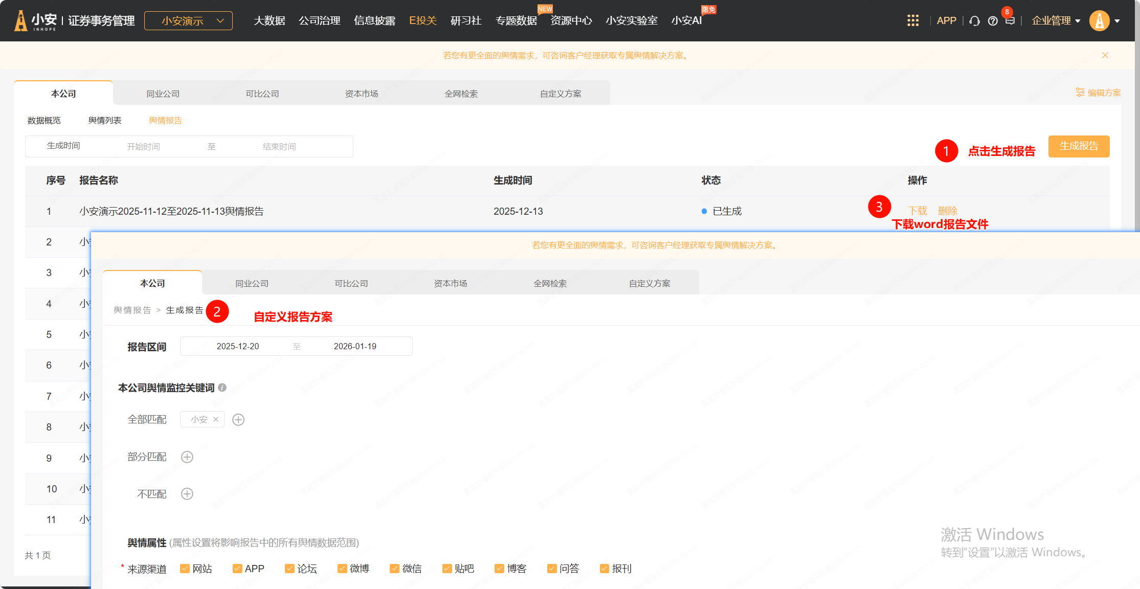切换至【舆情报告】页面,点击生成报告,自定义编辑报告方案,一键生成舆情报告,支持以word格式下载到本地。