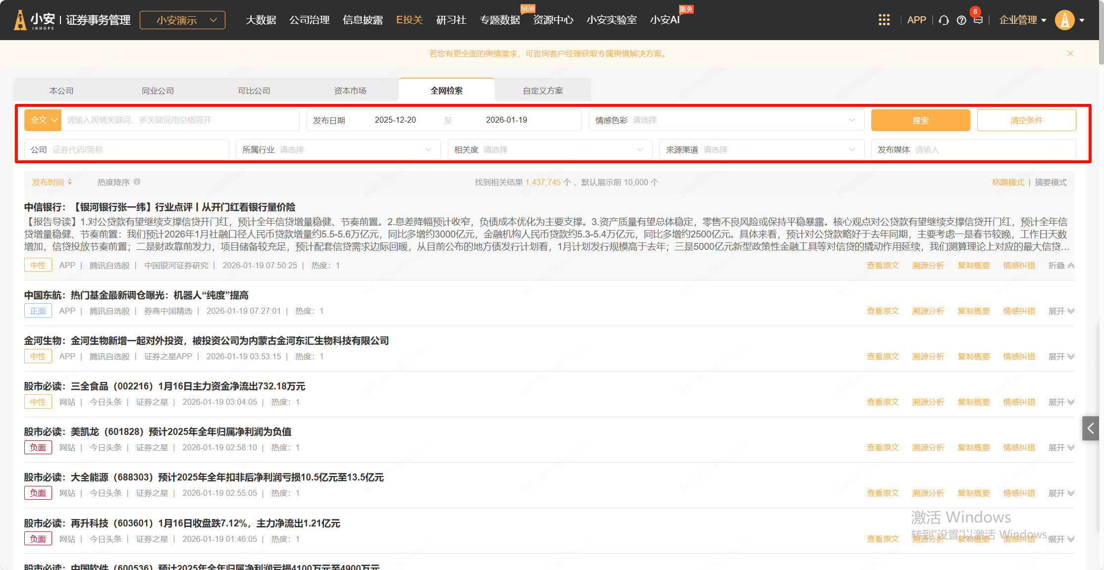 在【全网检索】模块,支持通过舆情标题/正文关键词、情感色彩、公司、所属行业、相关度、来源渠道、发布媒体搜索全网舆情。