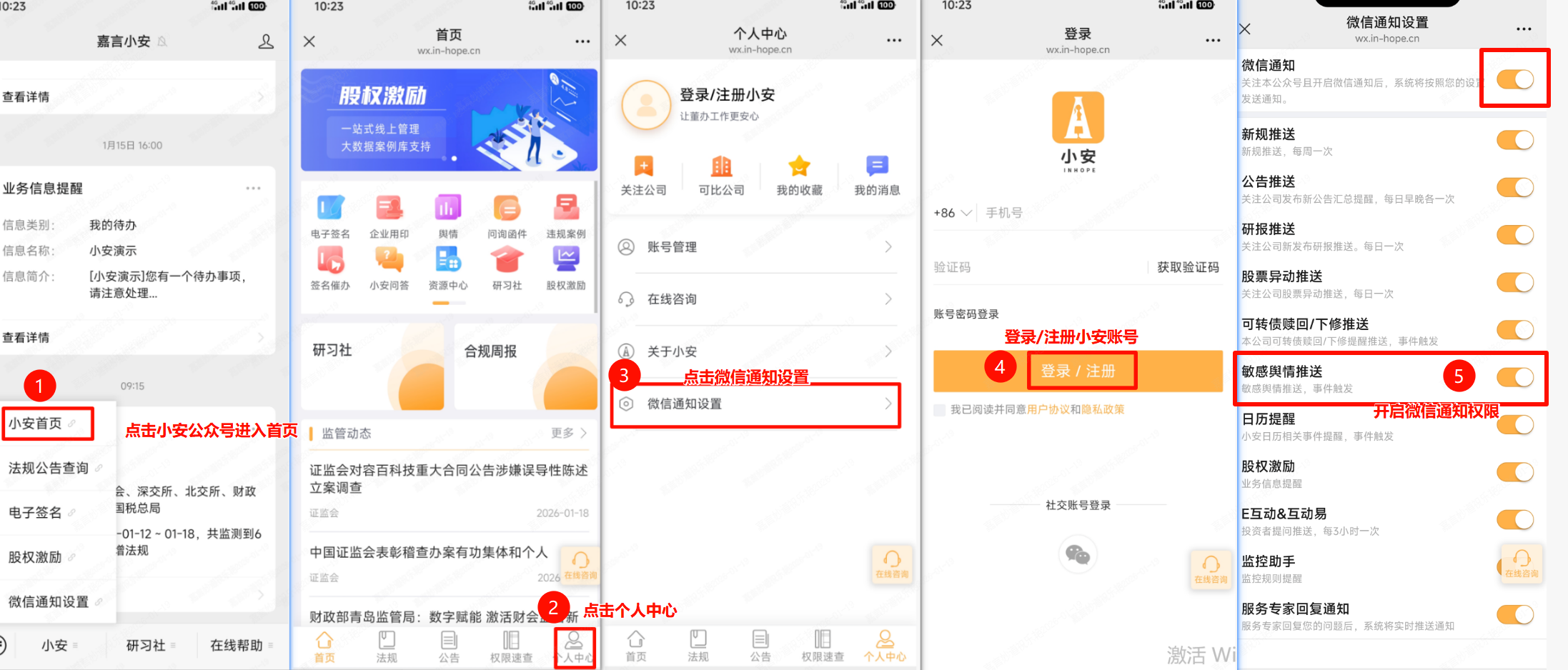 其次,微信关注“小安”公众号,点击菜单栏【小安-小安首页】后,点击个人中心登录小安账号,绑定微信并打开提醒。