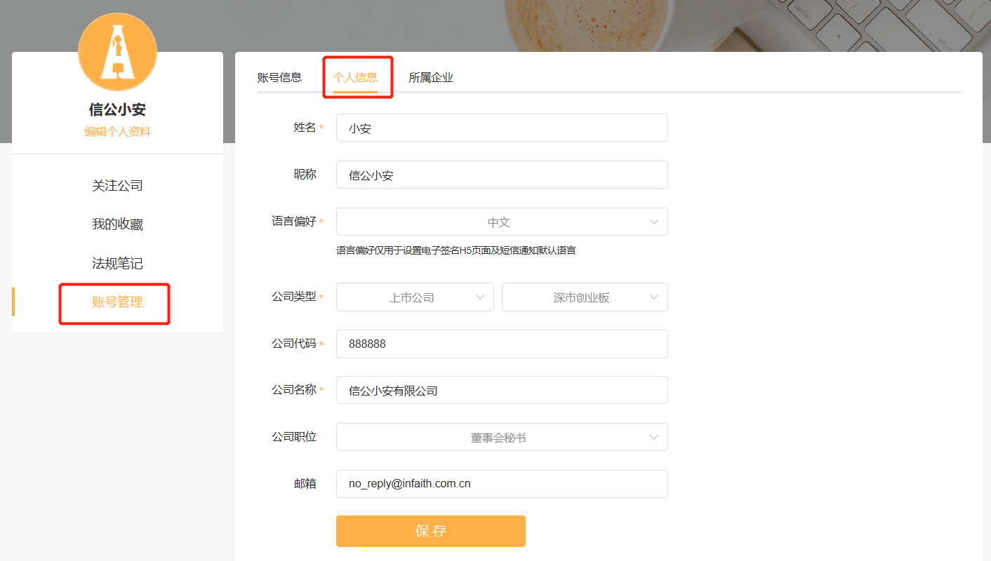 点击【个人中心-账号管理-个人信息】,可以修改姓名、昵称、公司职位、邮箱、证件号码等基本信息。