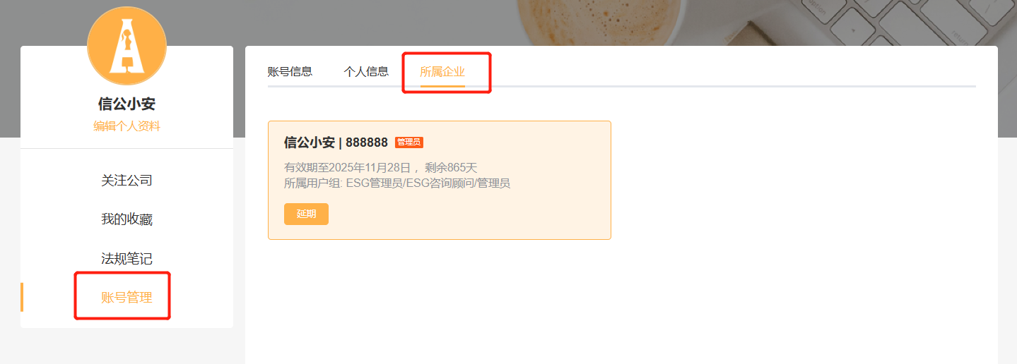 点击【个人中心-账号管理-所属企业】,可以查看自己加入的企业版公司以及自己的所属用户组。