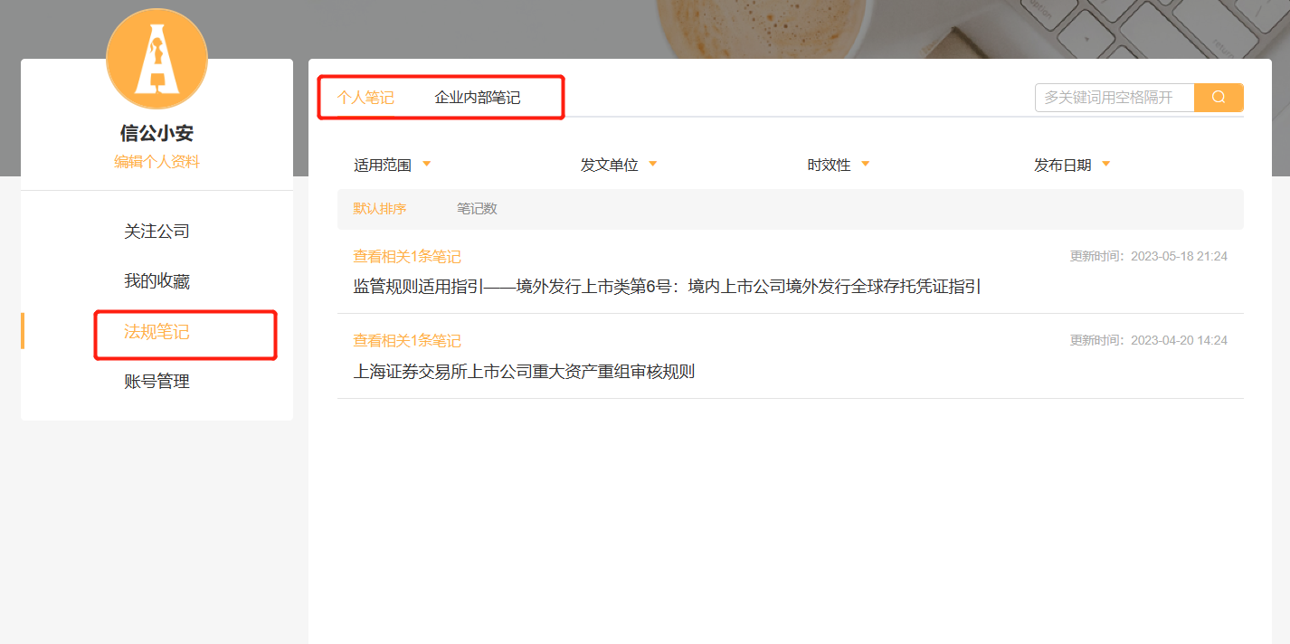 点击【法规笔记】可以查看自己或团队成员添加过的笔记内容,并支持按关键词查找或按条件筛选。