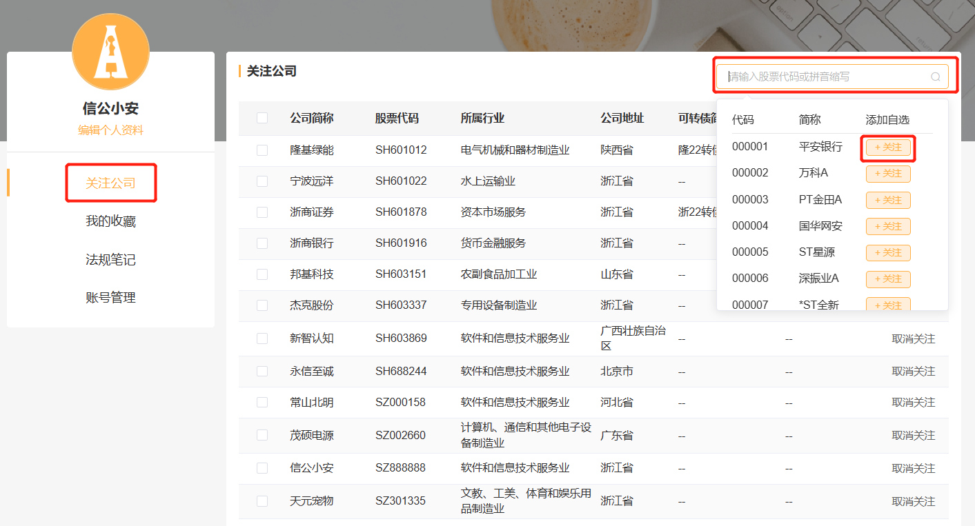 在【关注公司】列表中可以查看已关注的公司,在搜索框搜索股票代码或证券简称,并点击关注,即可将该公司设置为关注公司。