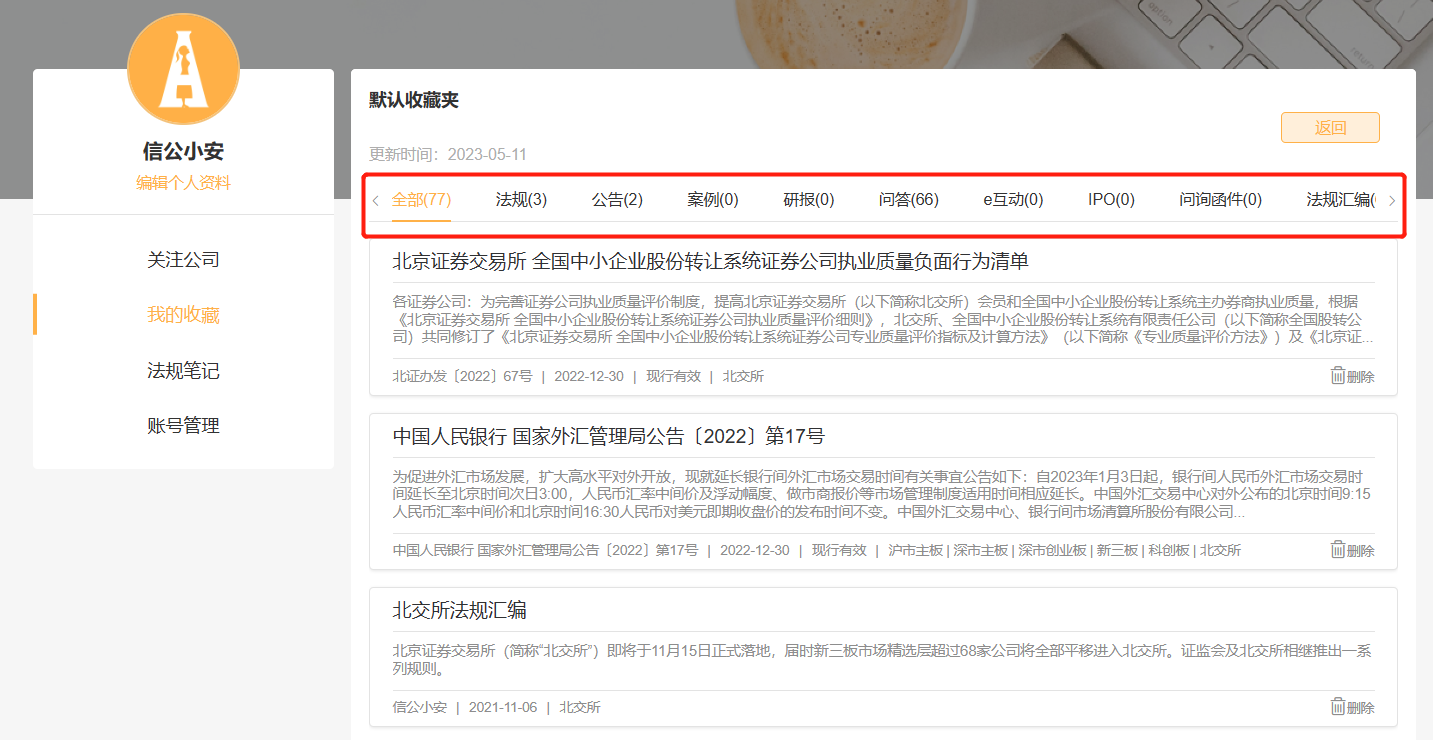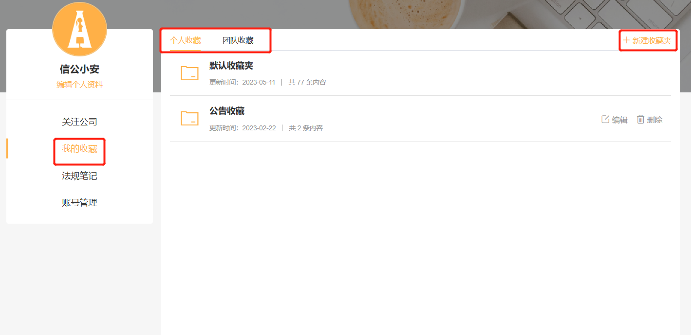 点击【我的收藏】,可以新建收藏夹;查看自己或者团队收藏的法规、公告违规案例等内容。