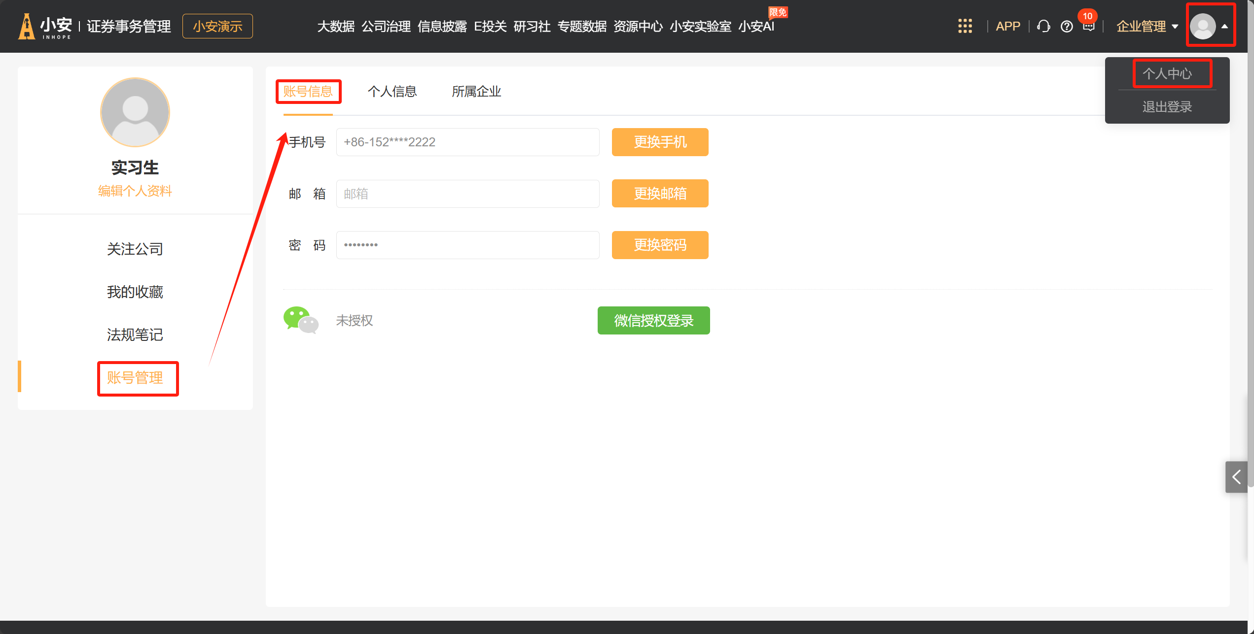 点击【个人中心-账号管理-账号信息】,可以进行更换手机号、更换邮箱、更换密码以及授权微信登录等操作。