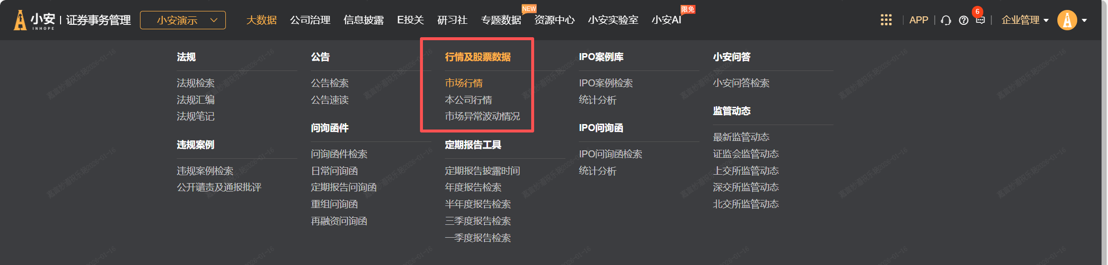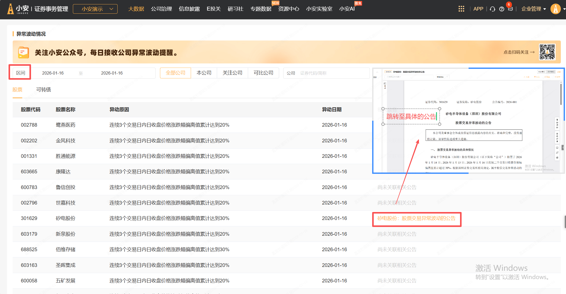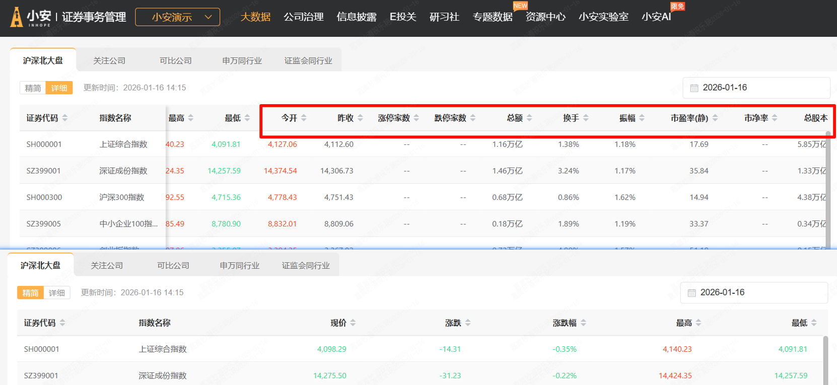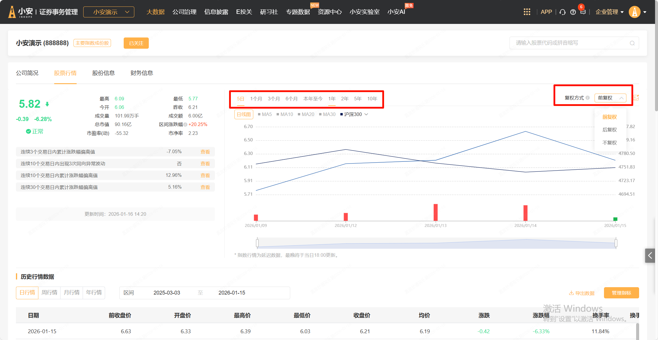 小安的【行情及股票数据】栏目,可以查看市场行情、本公司行情以及市场异常波动情况。