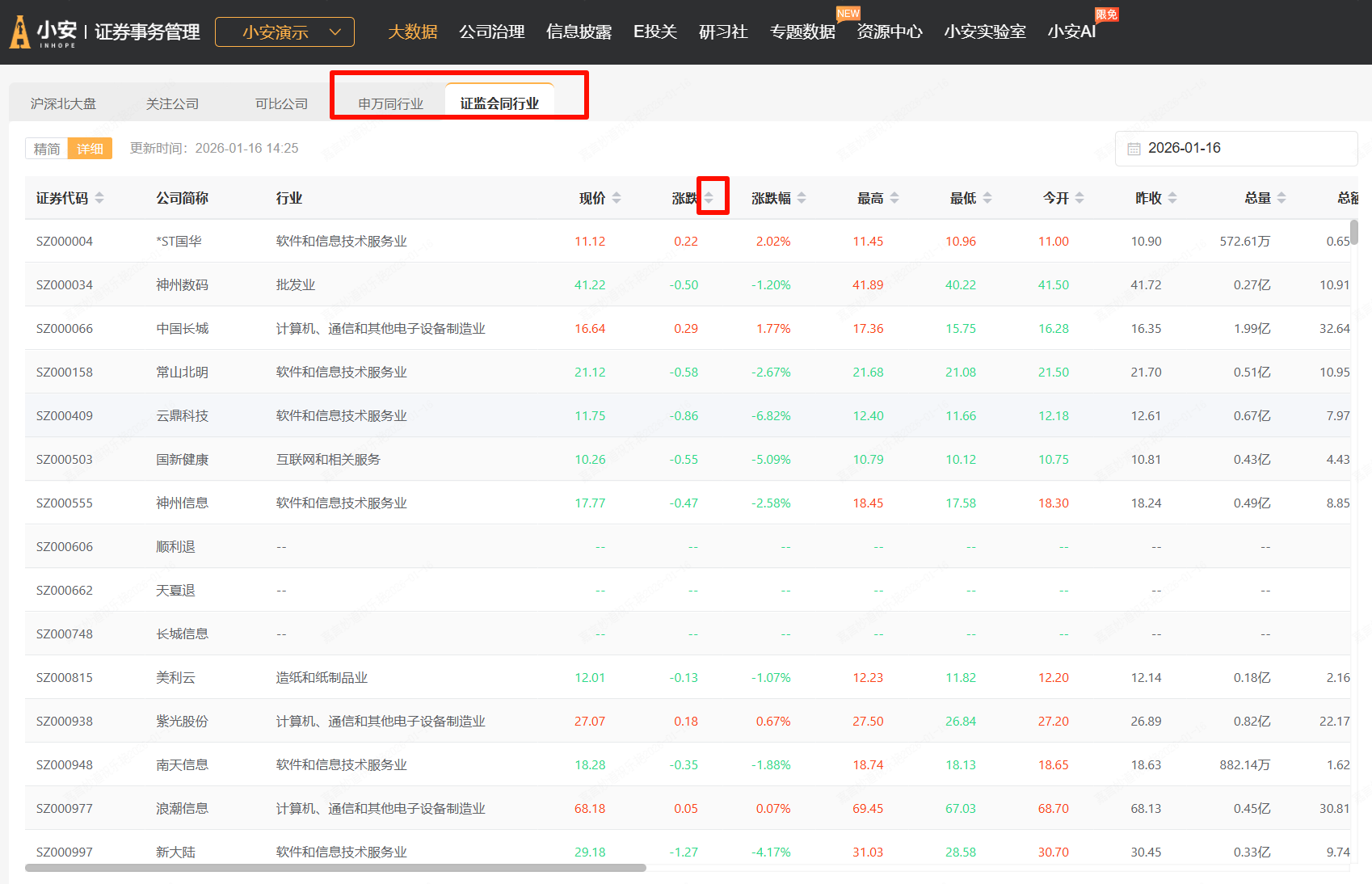 同时支持查看同行业数据:小安行情数据根据申万及证监会同行业分类整合同行业行情数据;并可点击按钮按升降序依次排列。
