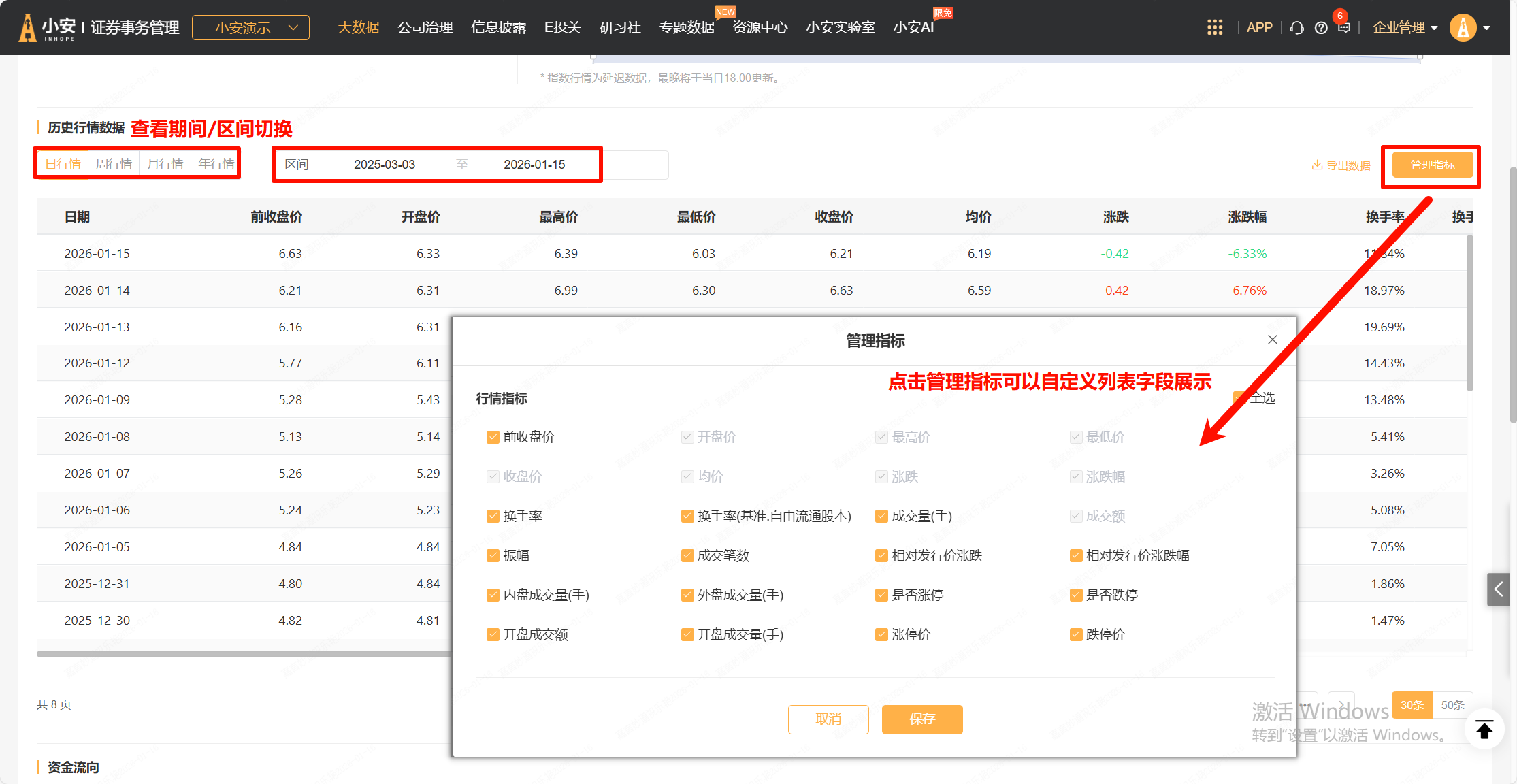 对于历史行情数据,可以切换期间(日/周/月/年行情)、自主选择区间和自定义指标查看。如果需要导出当前界面数据,可以点击“导出指标”对应下载Excel文件使用。