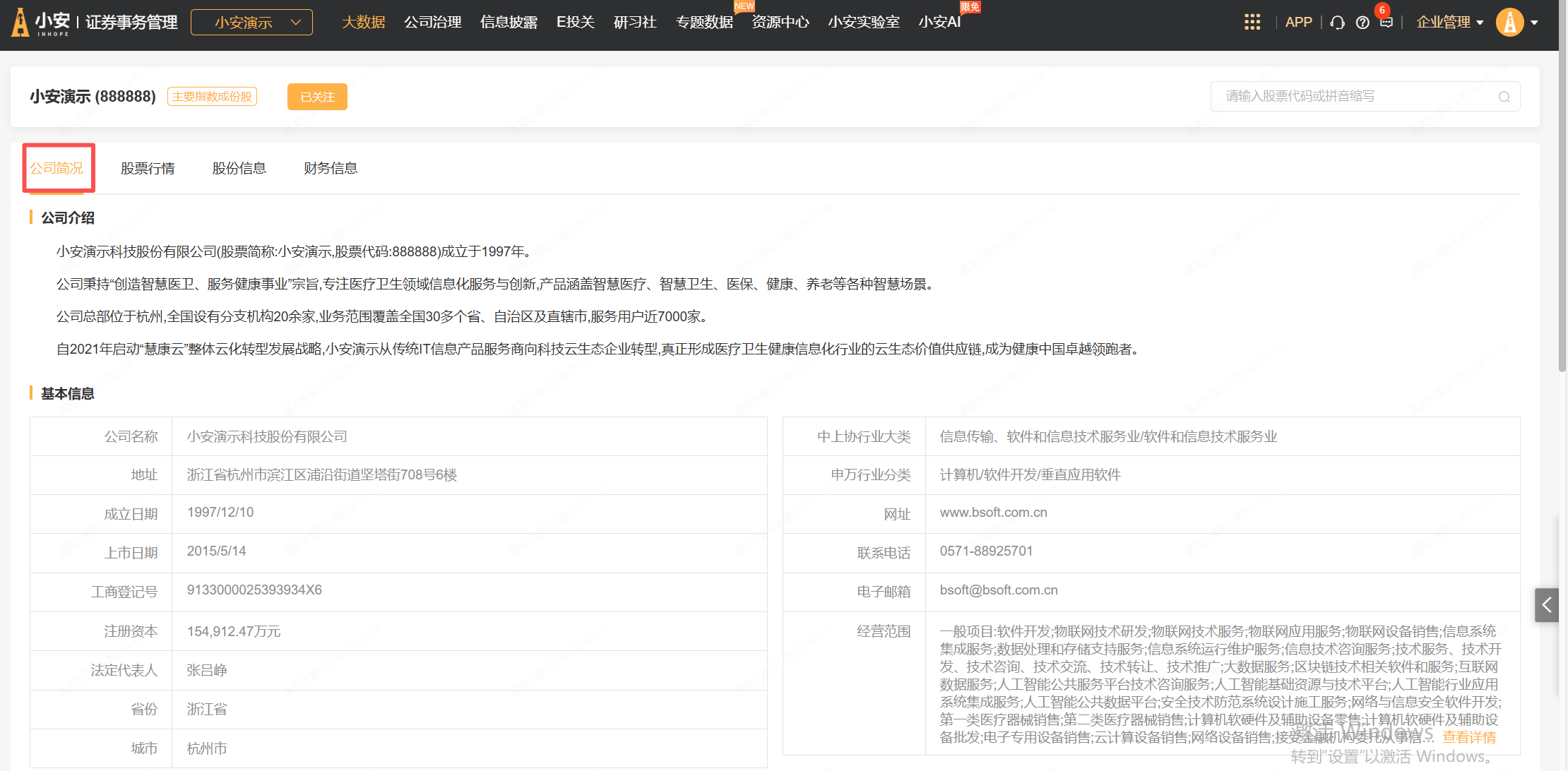 在查询看当前企业的股票行情数据时,如果需要查看对应的公司简况、股份信息、财务信息,可以进行切换查看。