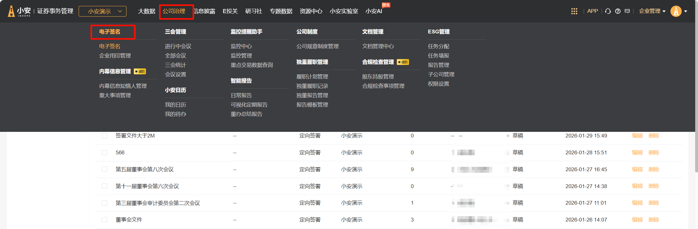 在【公司治理】菜单下,点击【电子签名】菜单,进入电子签名功能页面。