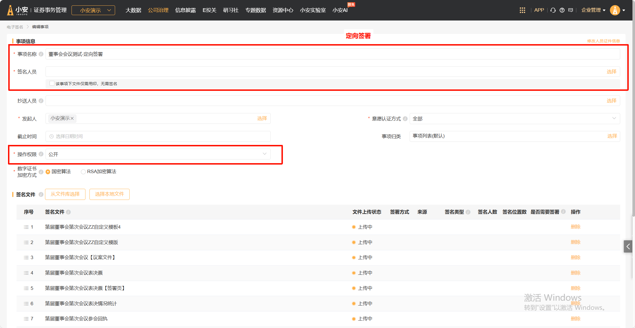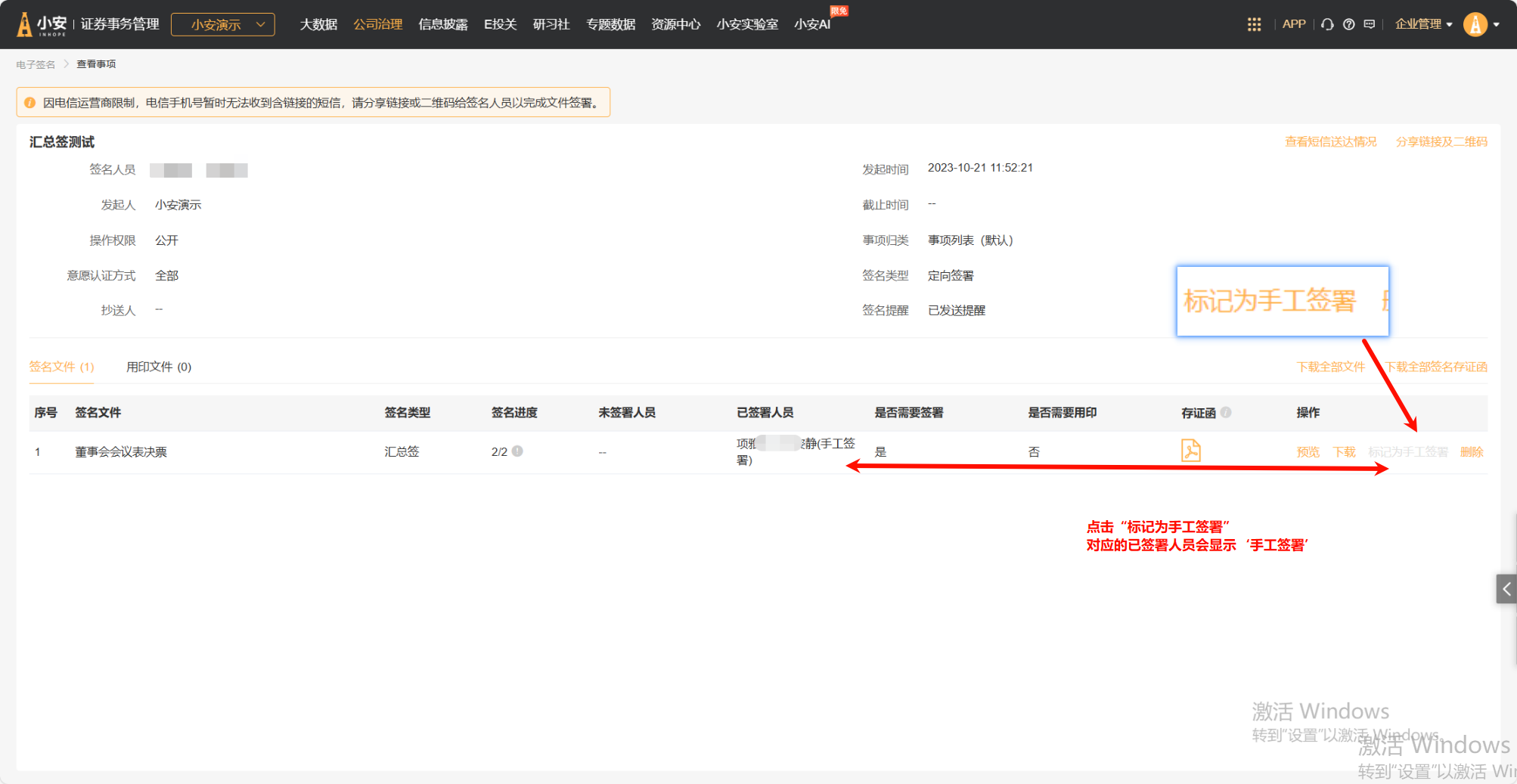 *定向签署: 适用于董、监事会等小型内部会议,创建签名事项时需指定签名人并定向推送签名链接。