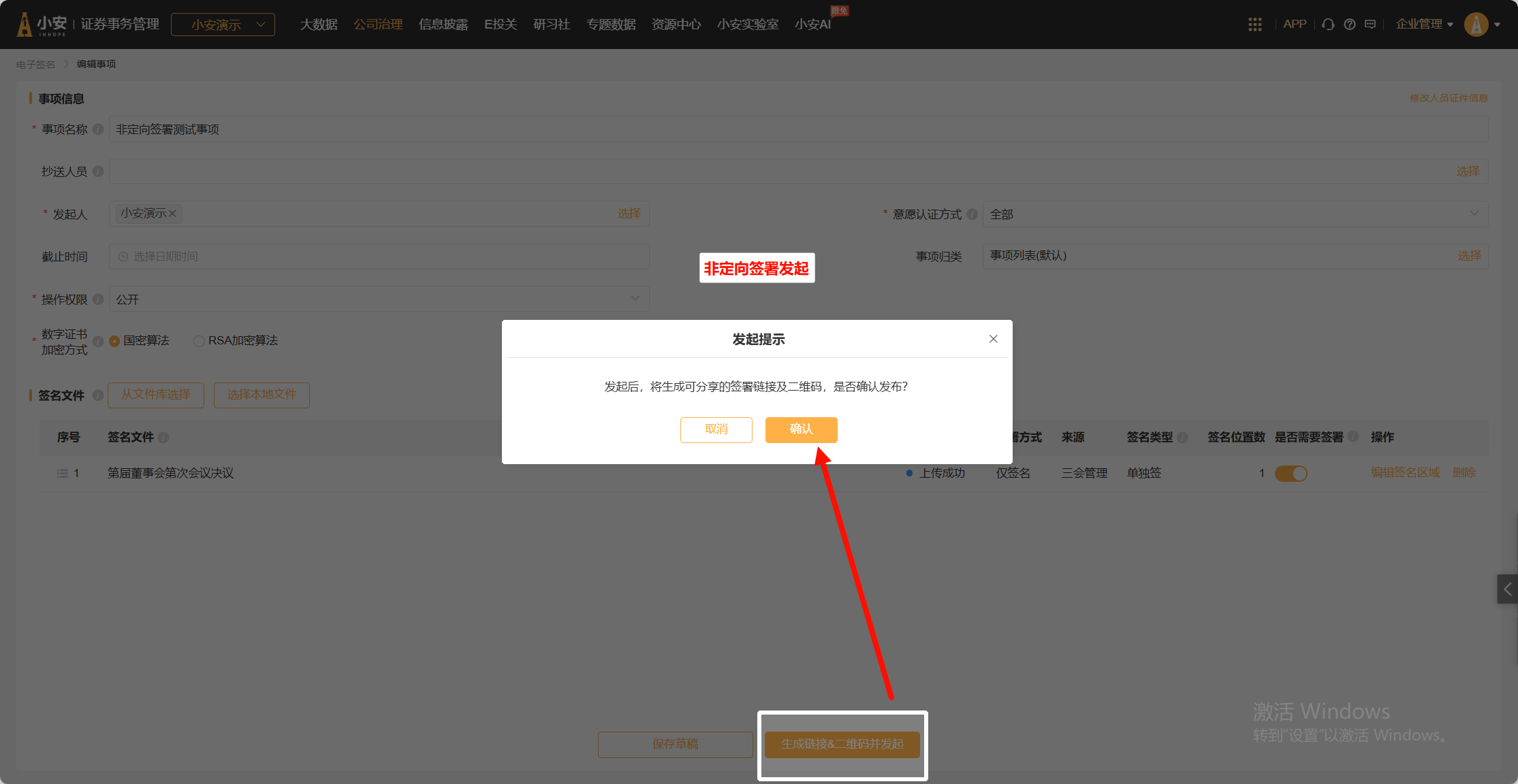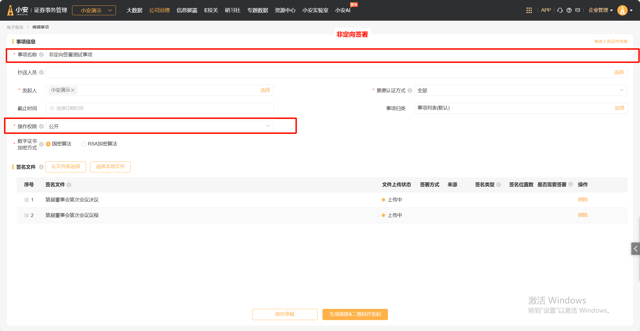 *非定向签署: 适用于投资者交流会、培训等大型内/外部会议,创建签名事项时无需指定签名人。