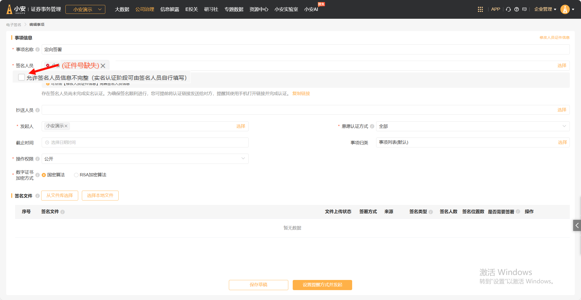 如勾选“允许签名人员信息不完整”,可以在事项发起后由签名人员在实名认证环节自行填写证件信息。