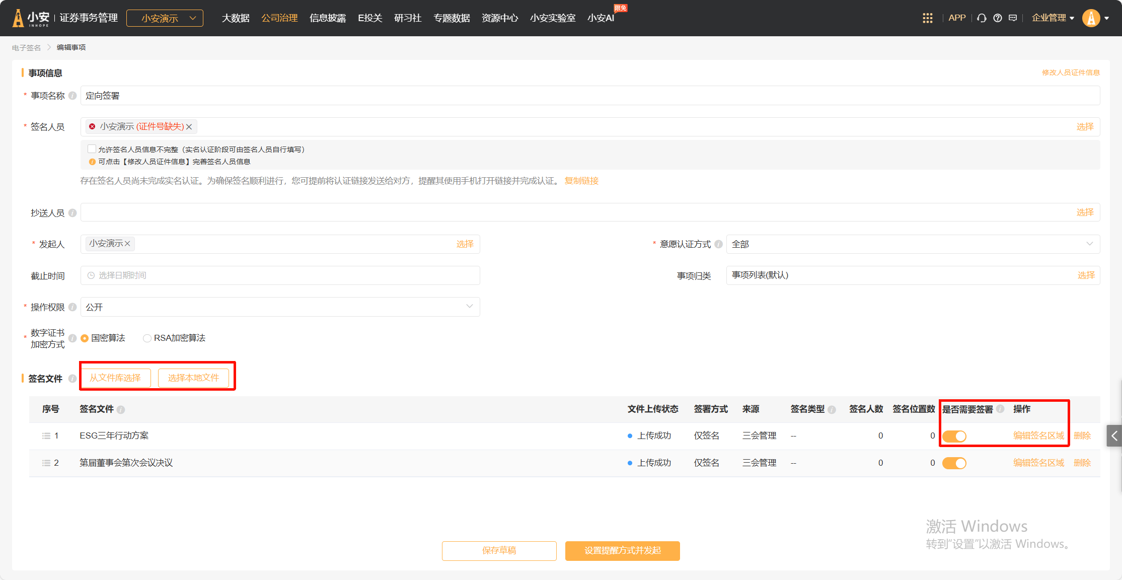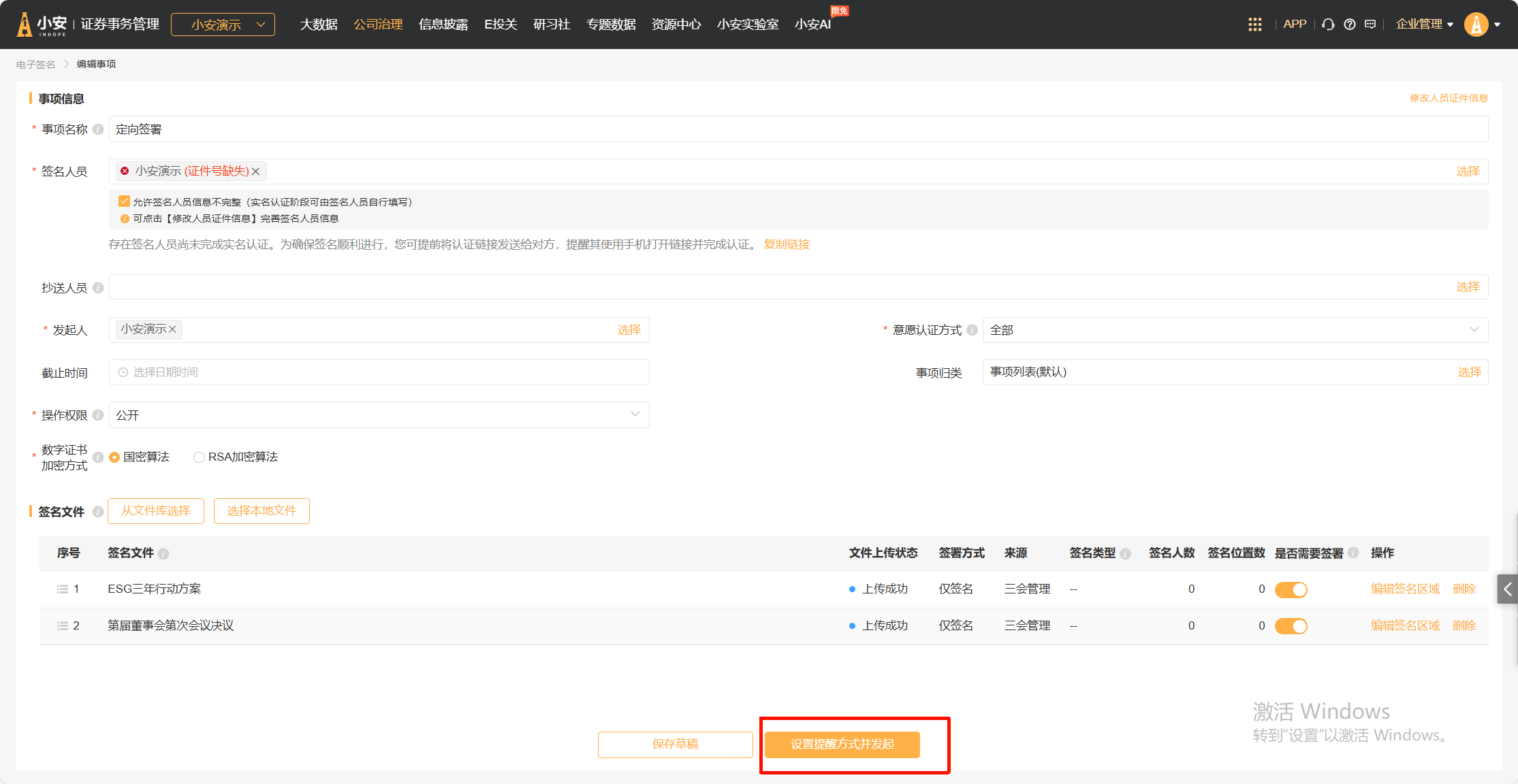文件中的签名及用印位置设置完成后,即可发起签名事项。