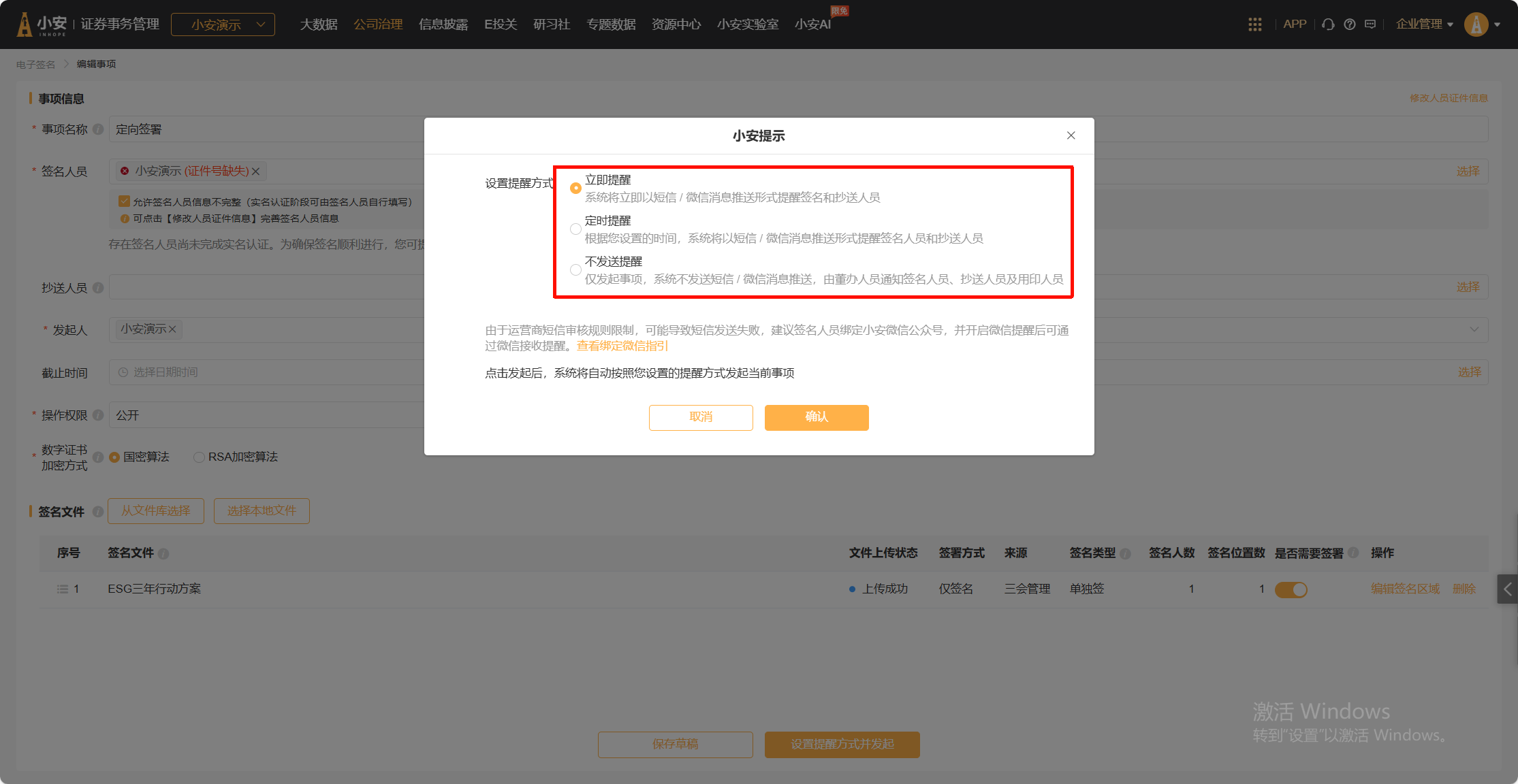 设置完成后可核对查看签名类型和签名位置数,同时支持保存草稿,可下次编辑。支持“立即”和“定时”两种提醒方式。发起签字事项后,系统将会给签名人员、抄送人员发送提醒短信、微信提醒,短信中包含有待签署文件链接。