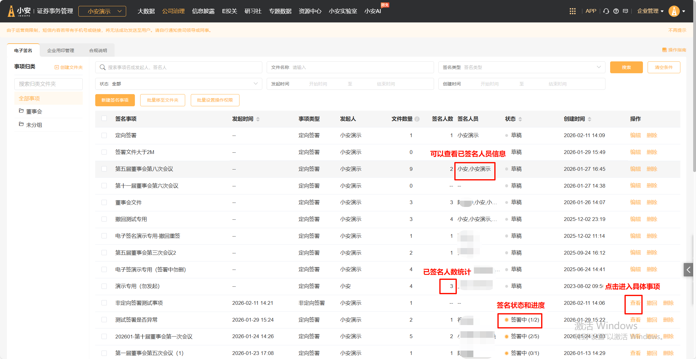 在事项列表页面可以查看该事项的签署状态。