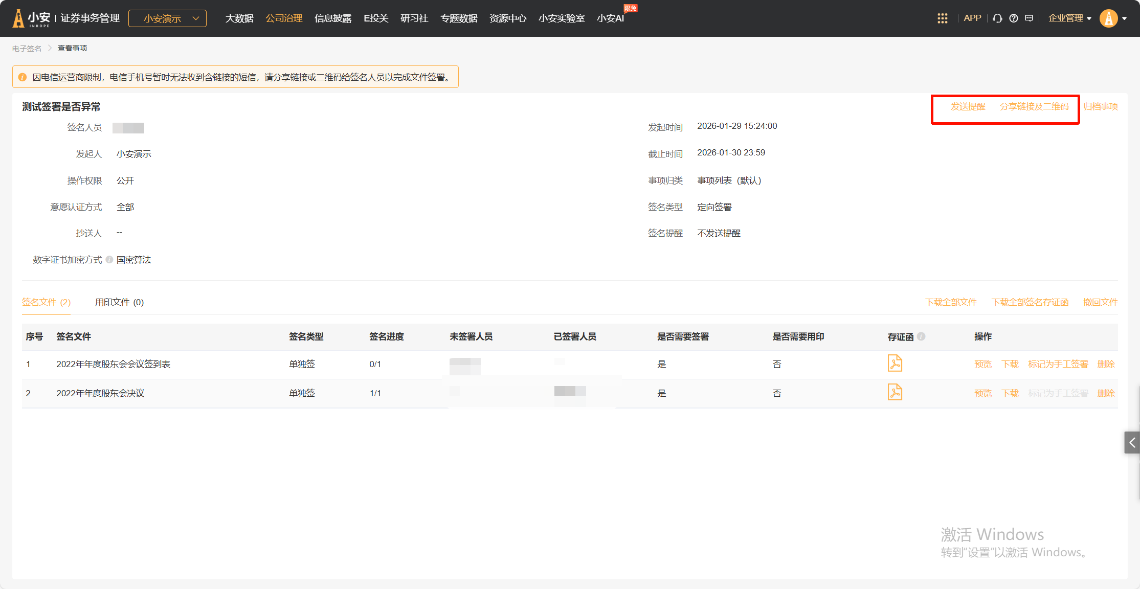 如遇到签名人员未签名,或者短信被删除等情况,可以点击“发送提醒”对其再次发送提醒短信,或点击“分享链接及二维码”将签名链接通过其他方式发给签名人员。