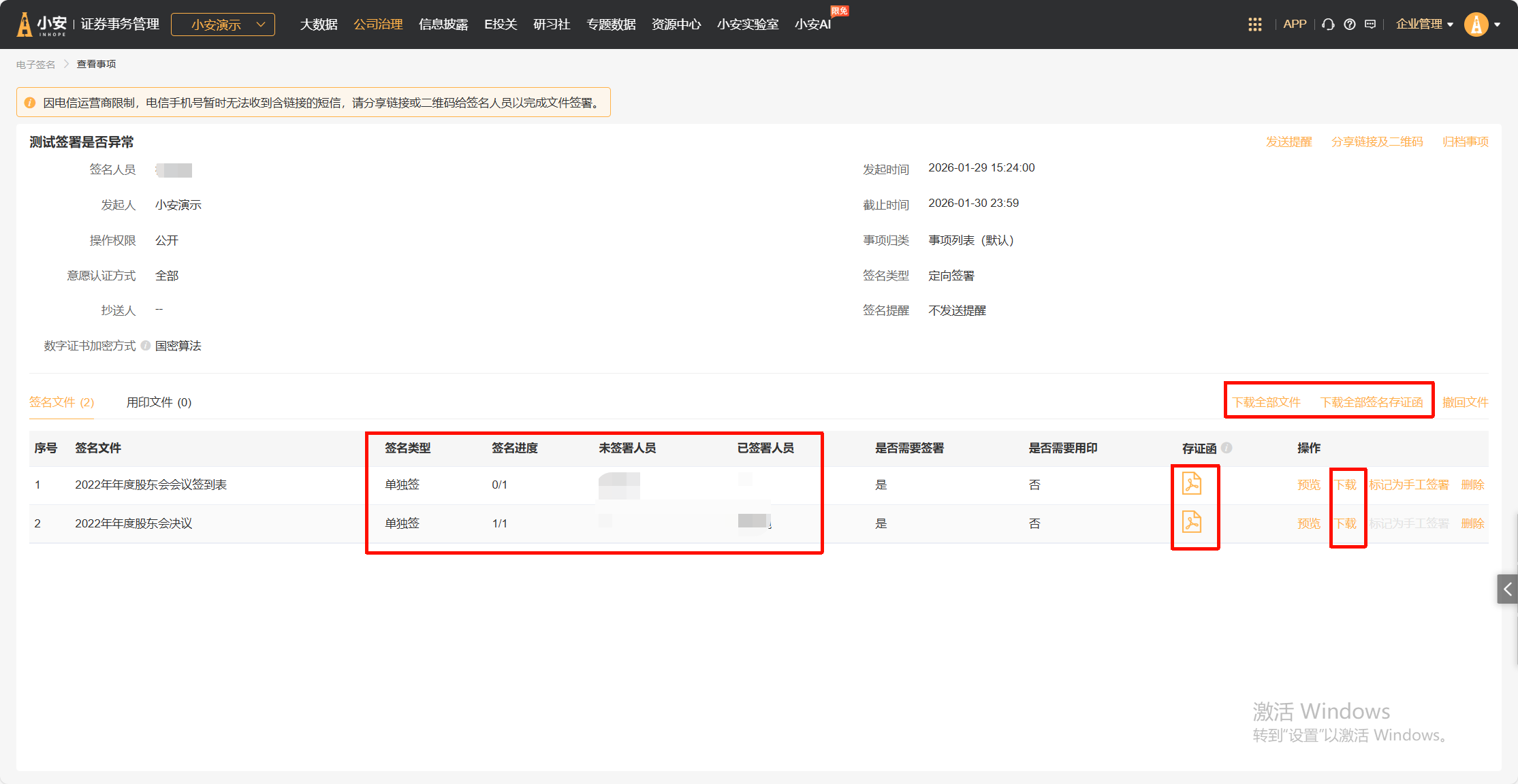 数字证书:每份签署文件都有专属存证信息,可以下载存证函并进行查看,以此证明签名合规有效。