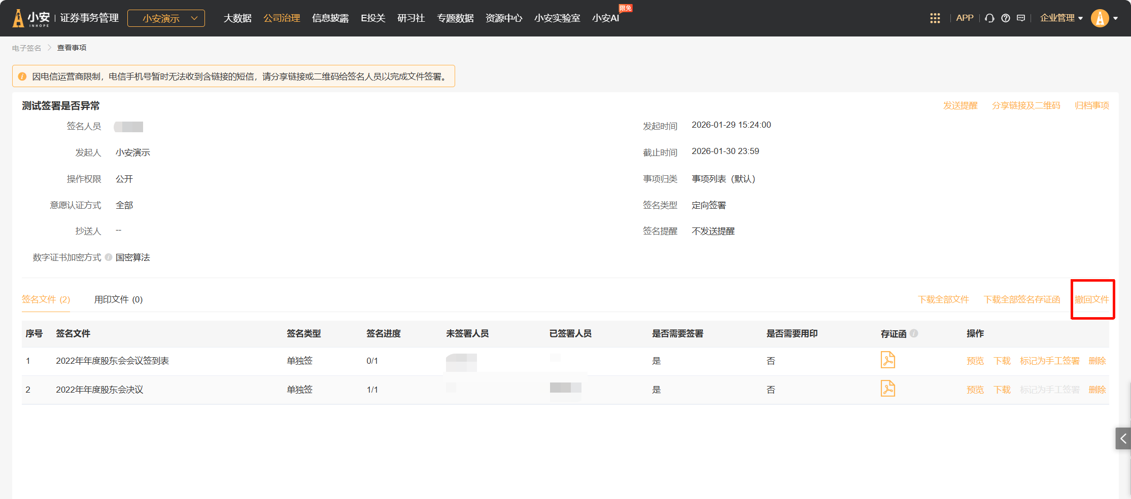 签名事项发起后,在签名过程中,如需要暂停签署或终止签署,可以在查看事项页面,点击“撤回文件”,在弹窗中选择撤回方式并勾选需要撤回的文件。