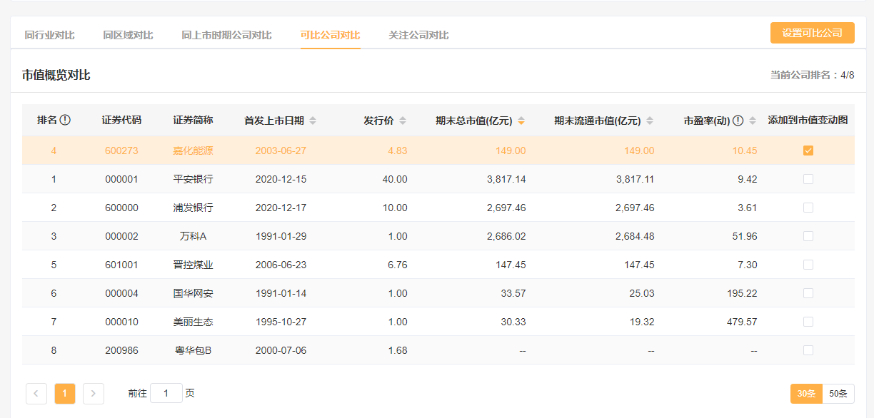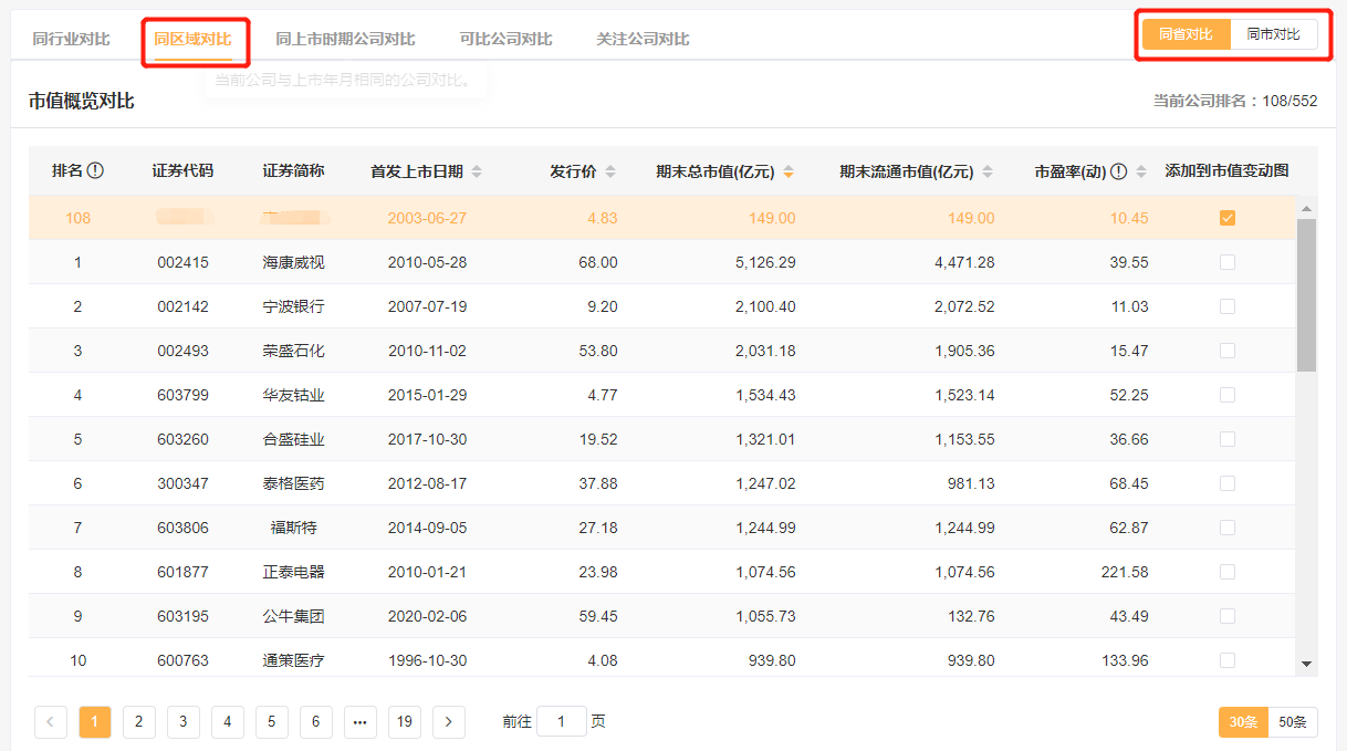 在【同区域对比】页面、【同上市时期对比】页面,可以查看到与本公司同一区域的上市公司以及与本公司同一时期上市的其他公司的市值、估值以及现金分红的对比情况。