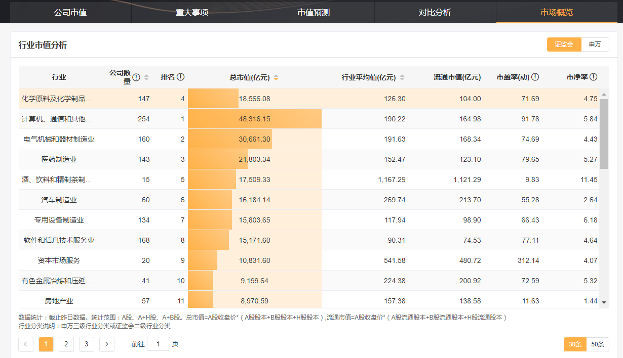 可以在【市场概览】模块查看“行业市值分析”以及“A股市场整体市值分析”。