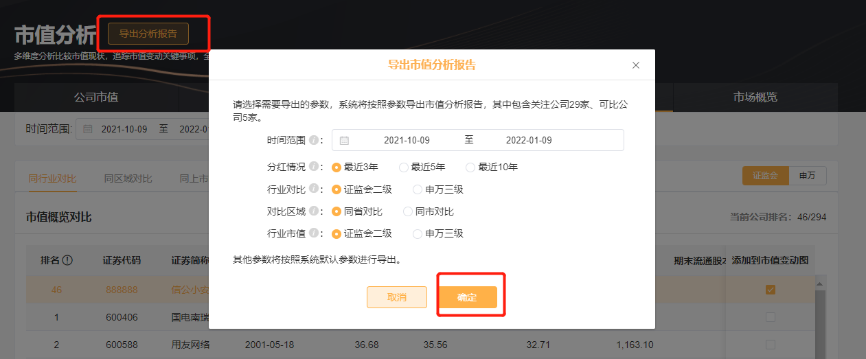 点击左上方【导出分析报告】,选择报告中涉及的参数,导出一份非常详细的市值分析报告。