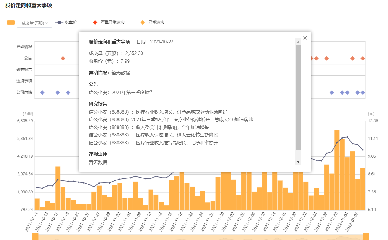在【重大事项】模块中,可以看到公司股价与公告、研报报告、违规事项以及公司舆情的相关情况。在日期上方会通过小方块来显示当天是否有相关事项发生,鼠标点击小方块将展示当天的事项详情以及基本行情。