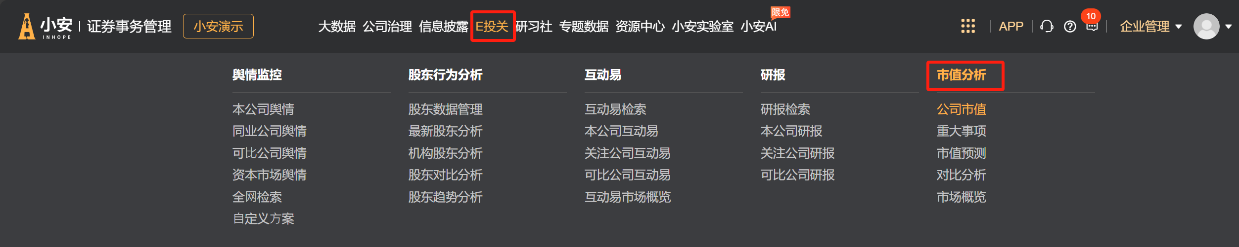小安的【市值分析】栏目,可以多维度分析比较市值现状,追踪市值变动关键事项,全面呈现机构预测,帮助公司进行长期有效的市值管理。