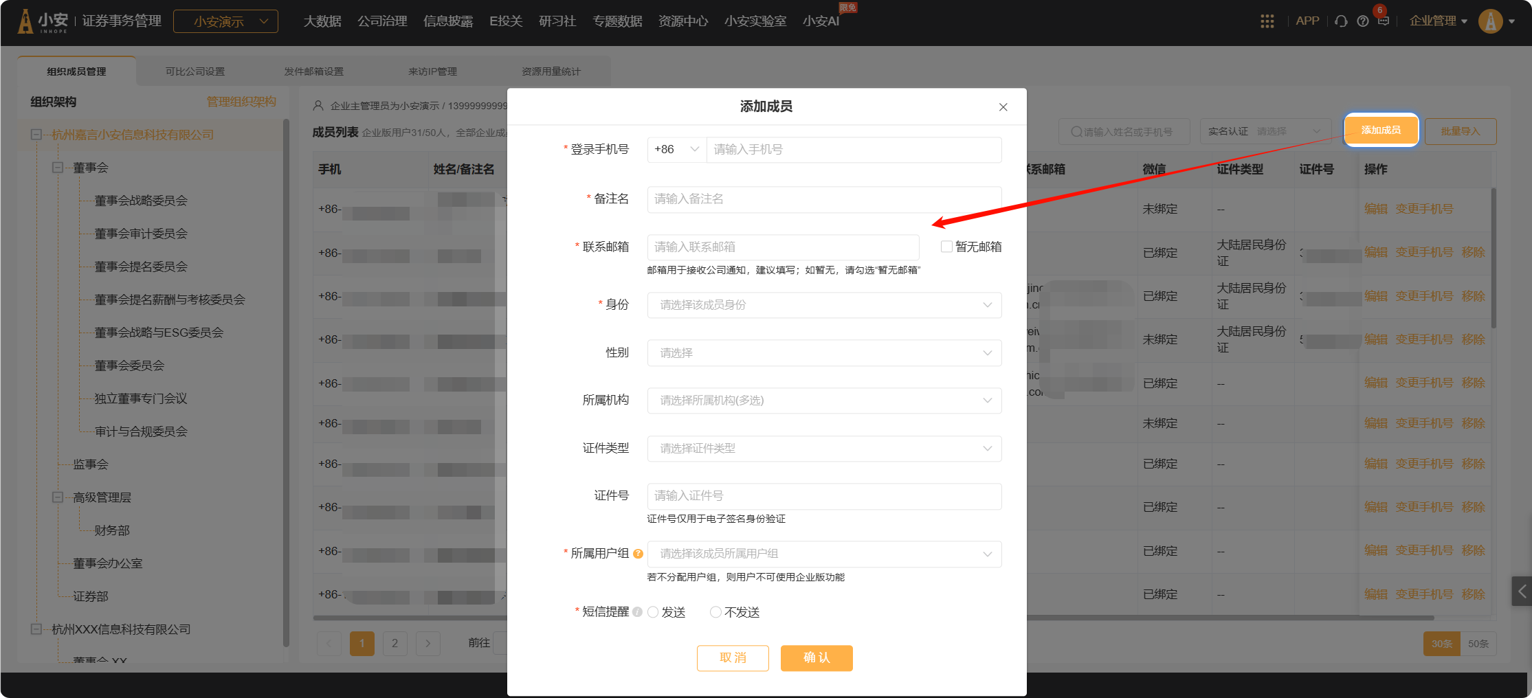 在“企业管理-组织成员管理”页面,点击【添加成员】,填写好用户信息,即可添加企业版用户或董高信息。
