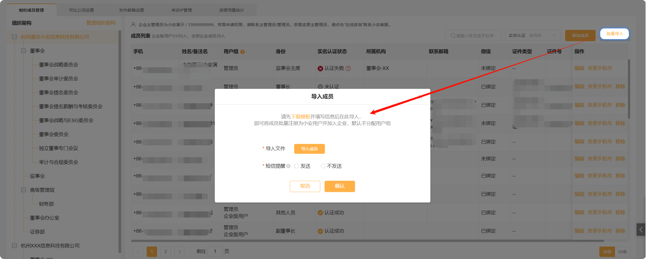 点击【批量导入】,下载系统提供的模板,根据模板填写人员信息,可批量导入董高信息。
