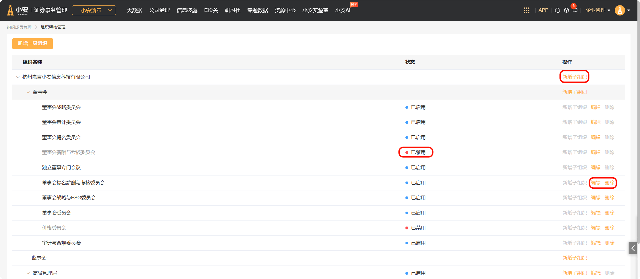 可以添加、编辑、删除组织,对于不适用公司的组织,可以将其设置为禁用。