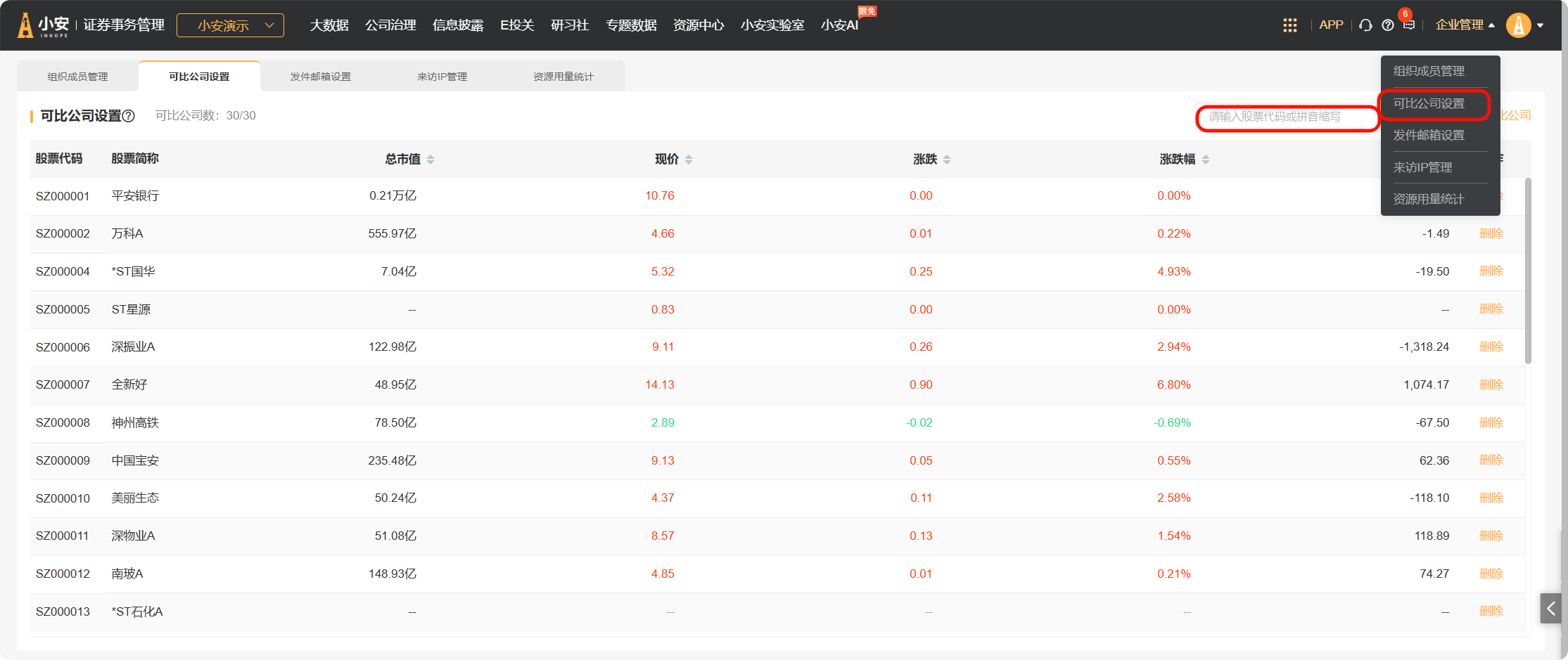 点击进入【企业管理-可比公司设置】,管理员可以在此添加可比公司,搜索股票代码或简称,点击添加即可。