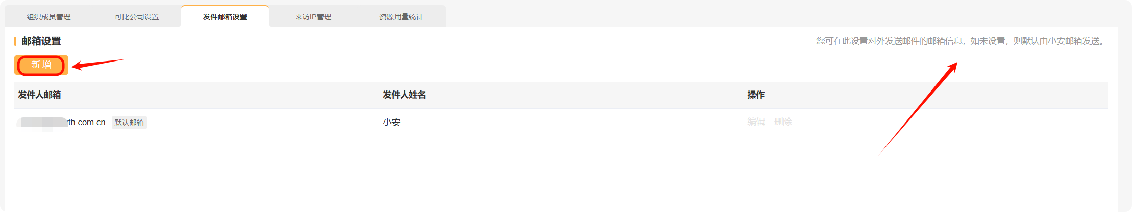 点击进入【企业管理-发件邮箱设置】,管理员可以在此设置小安企业版系统对外发送邮件的邮箱信息;如未设置,则默认由小安发送。