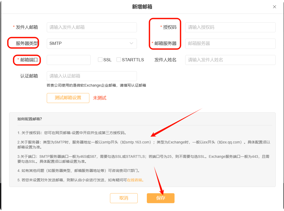 (2)关于服务器:类型为SMTP时,服务器地址一般以smtp开头(如smtp.163.com);类型为Exchange时,一般以ex开头(如ex.qq.com)。具体配置须以邮箱设置为准。