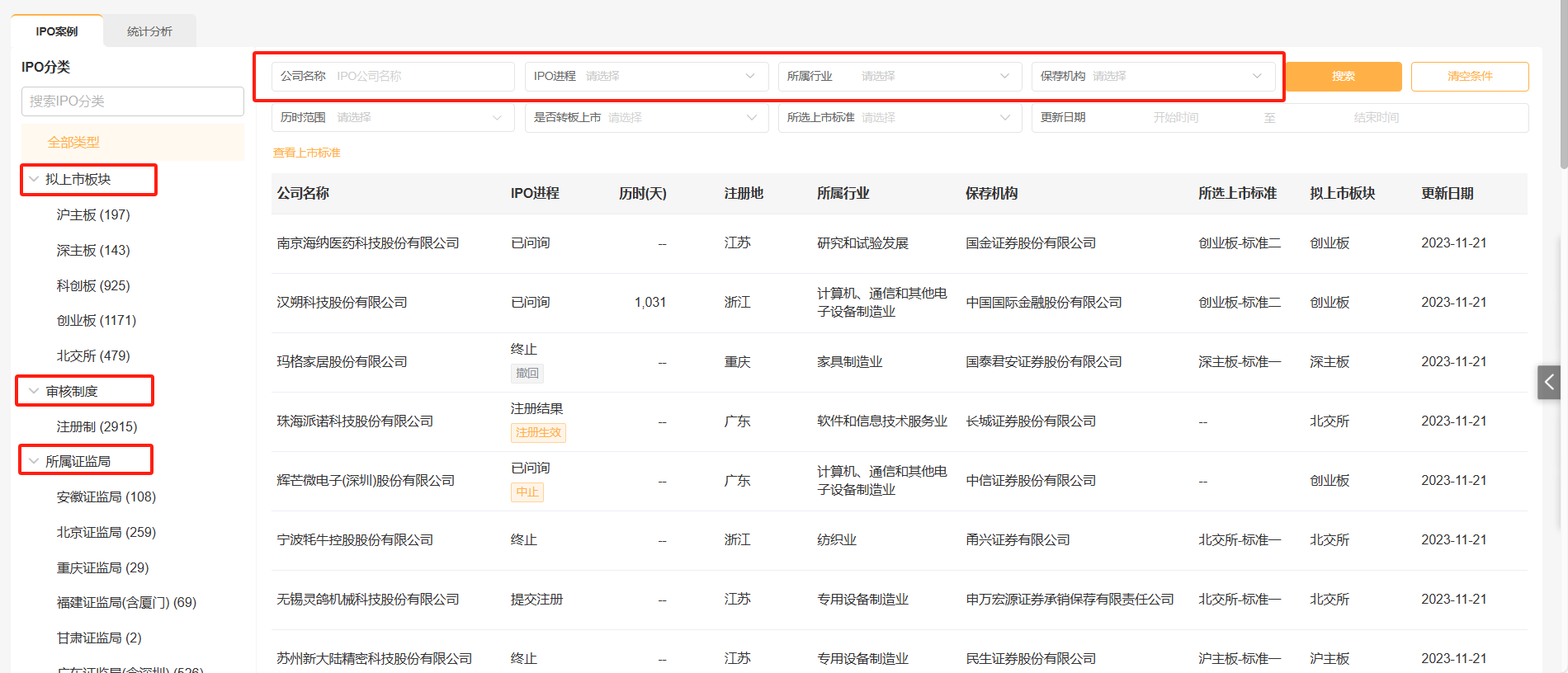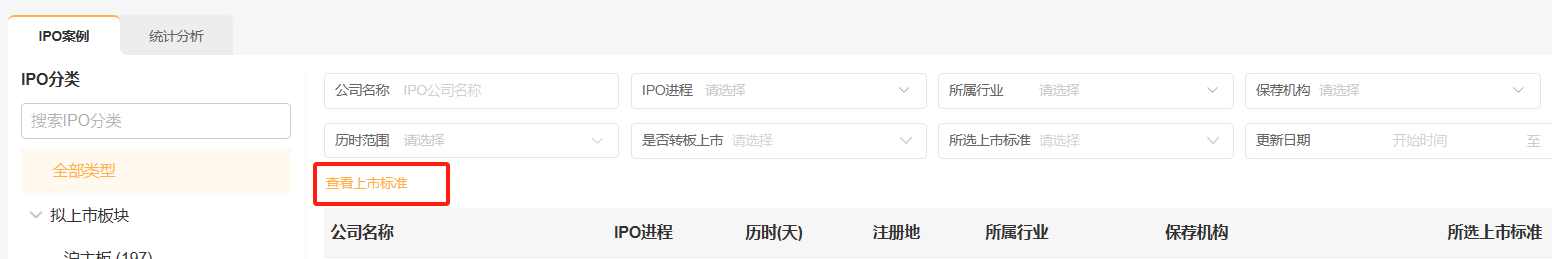 小安支持按照IPO分类,如“拟上市板块”“审核制度”“所属证监局”查找相关IPO案例,同时,支持直接以公司名称或按进程、行业、保荐机构、上市标准分类查询。