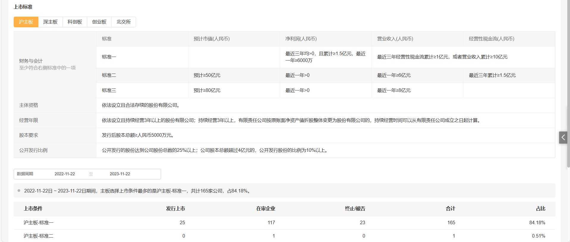 点击页面上的“查看上市标准”按钮,即可查阅各板块上市标准。