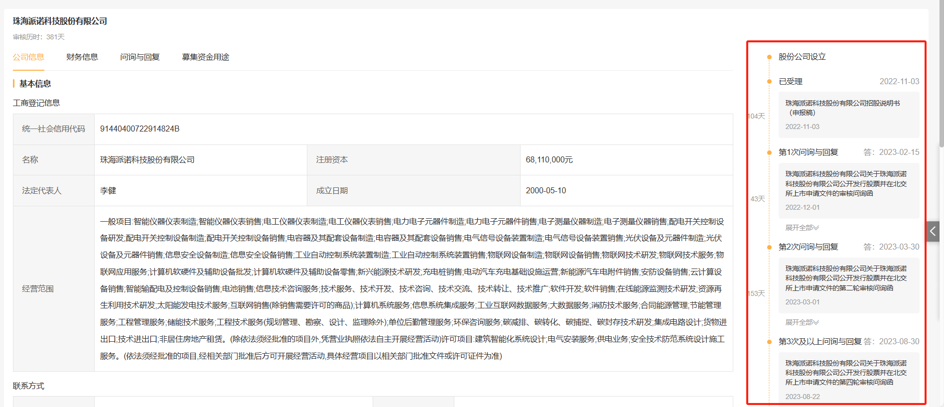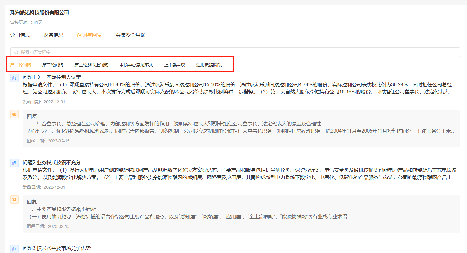 进入“问询与回复”页面,可以以问答形式 查看各阶段的问询内容以及公司的答复。