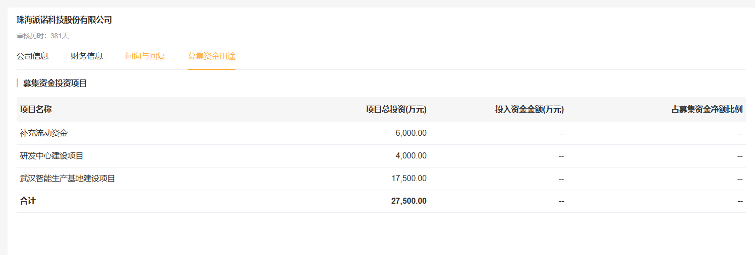 在“募集资金用途”页面,系统整理了表格供用户快速查看。