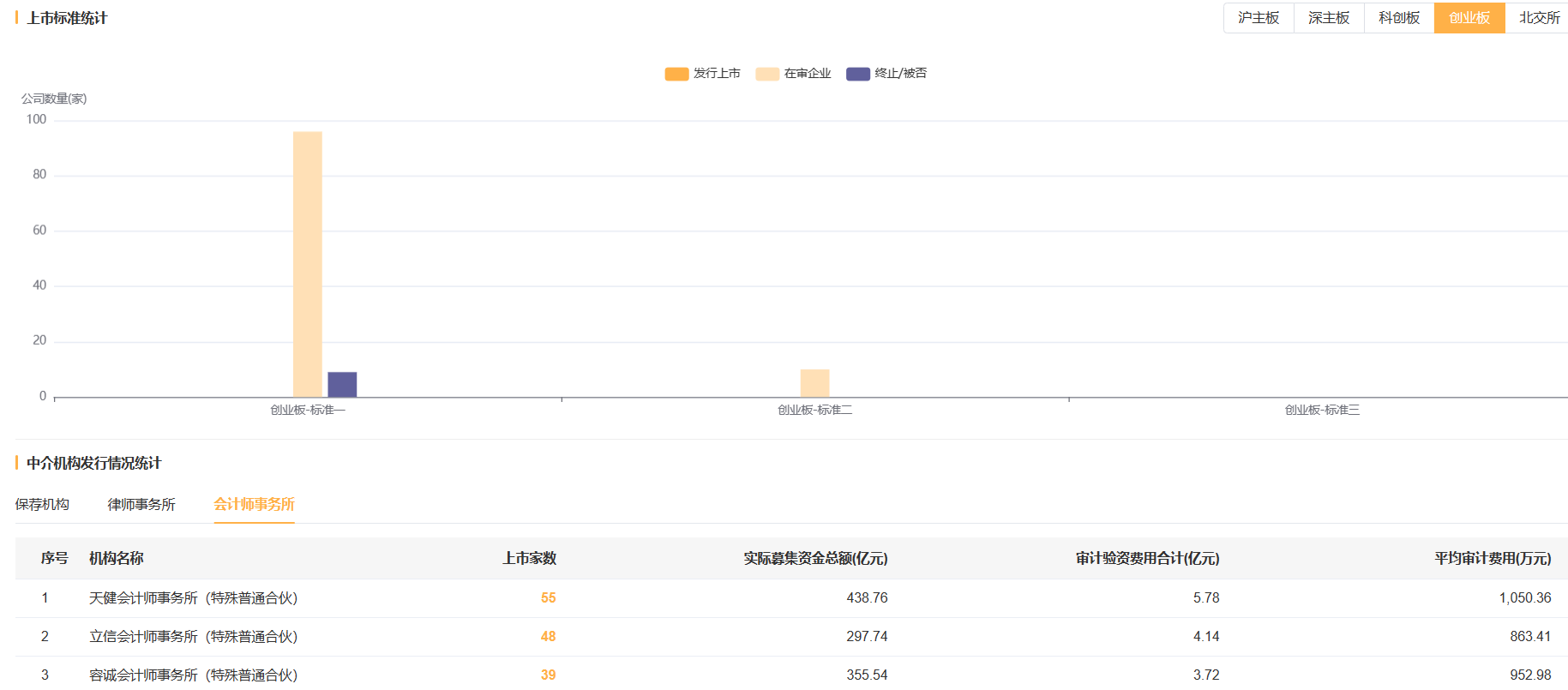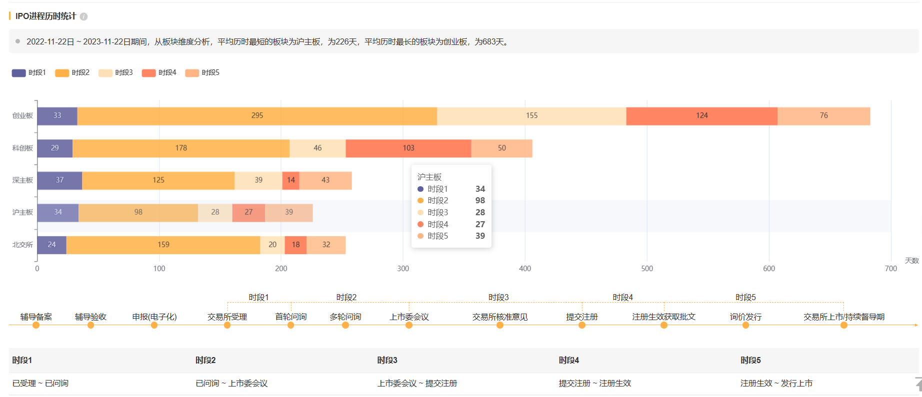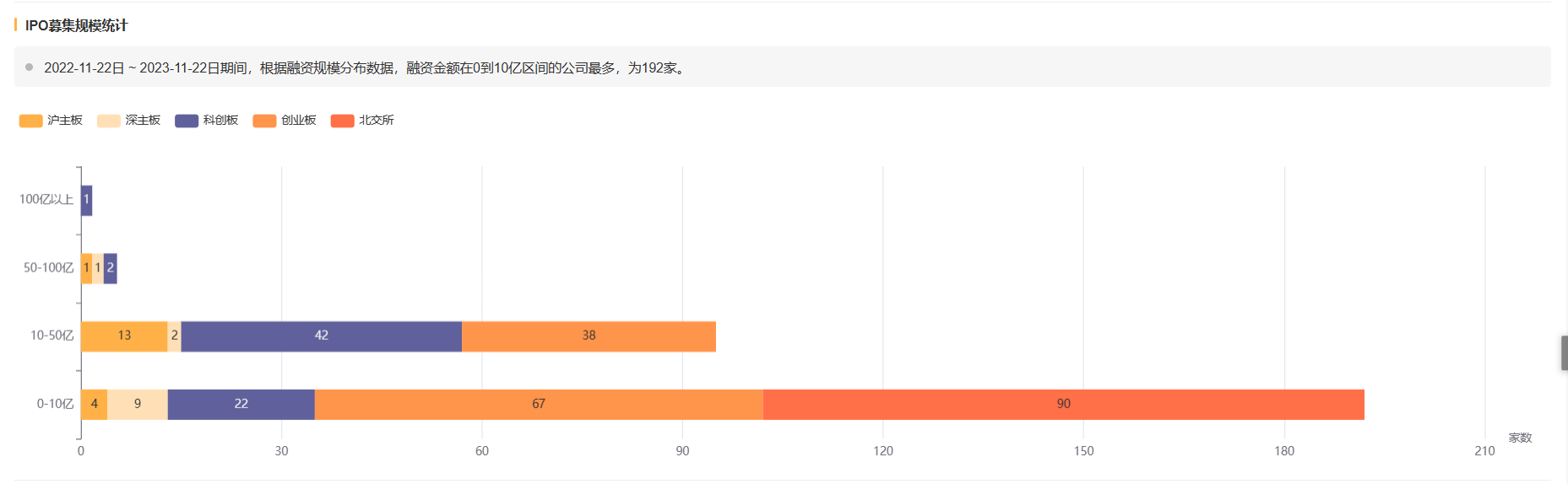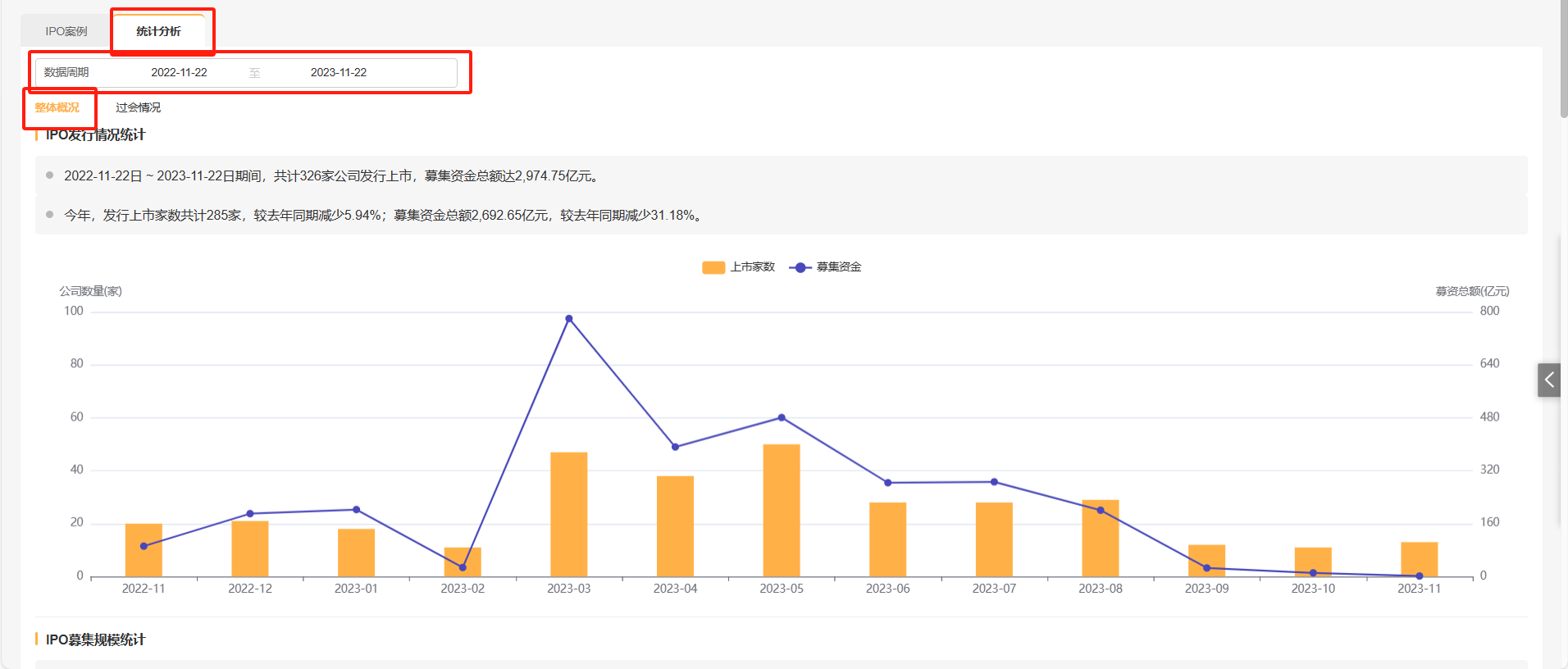 切换至“统计分析”,支持用户选择一段时间范围,系统将通过可视化图表形式呈现这段时间期限内的IPO发行情况、IPO募集规模统计、IPO进程历时统计、上市标准统计、中介机构发行情况。